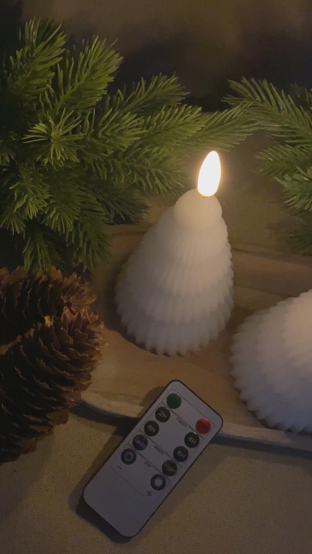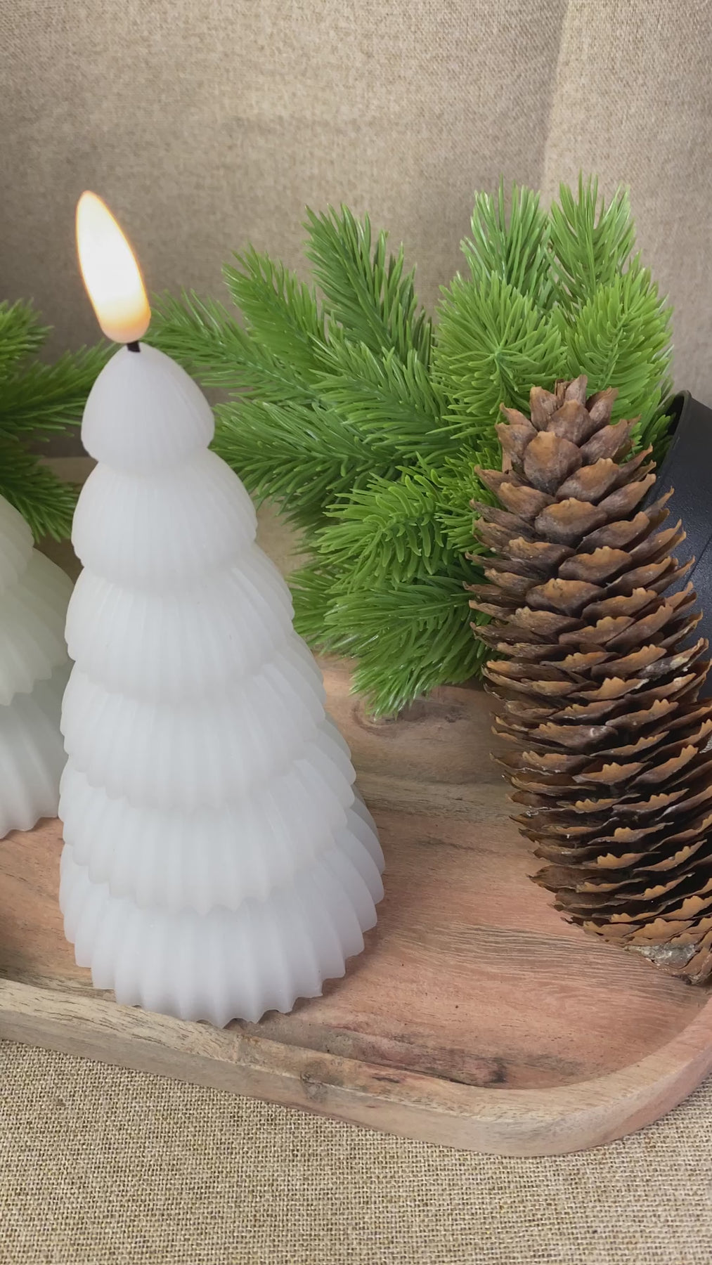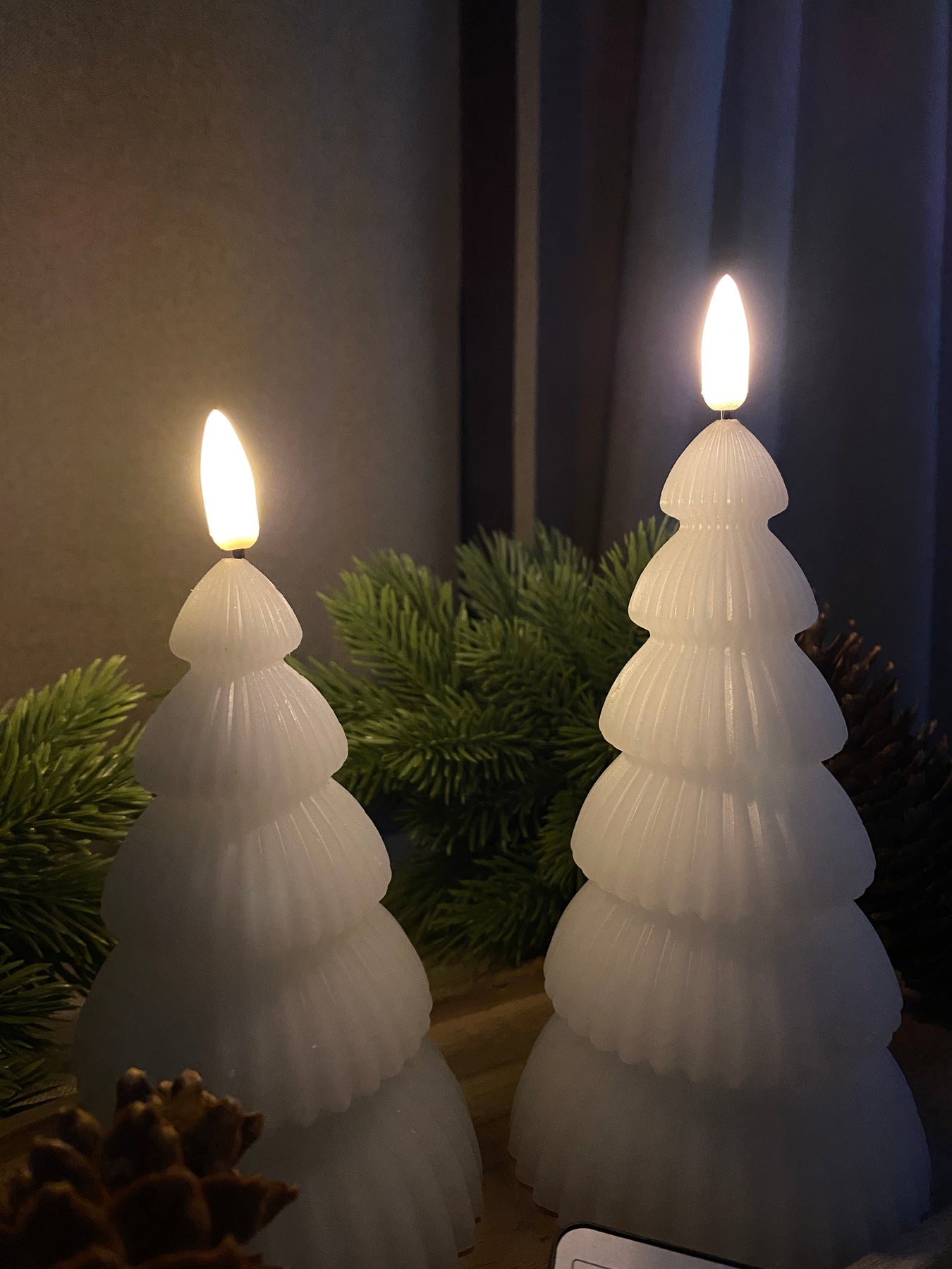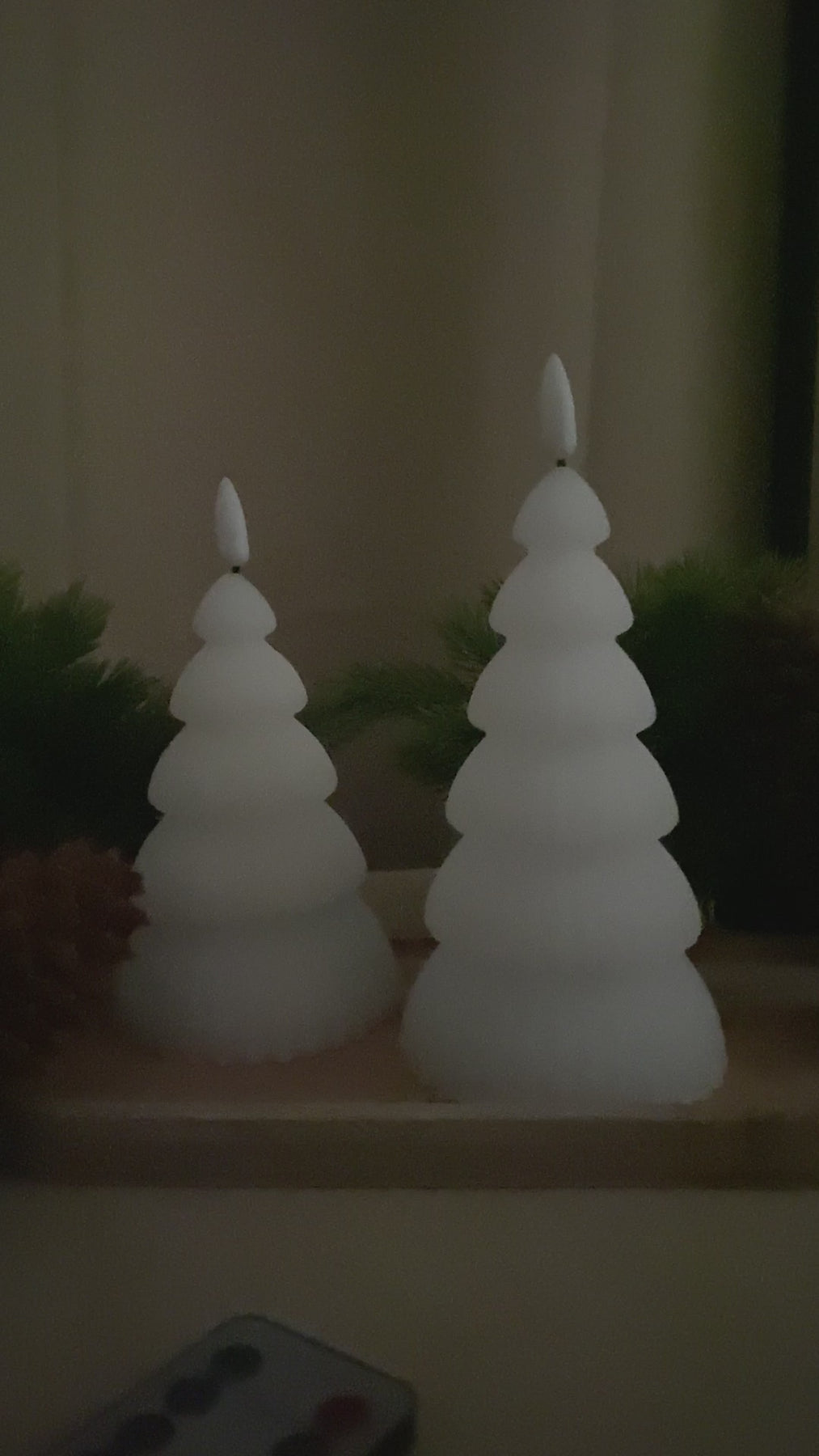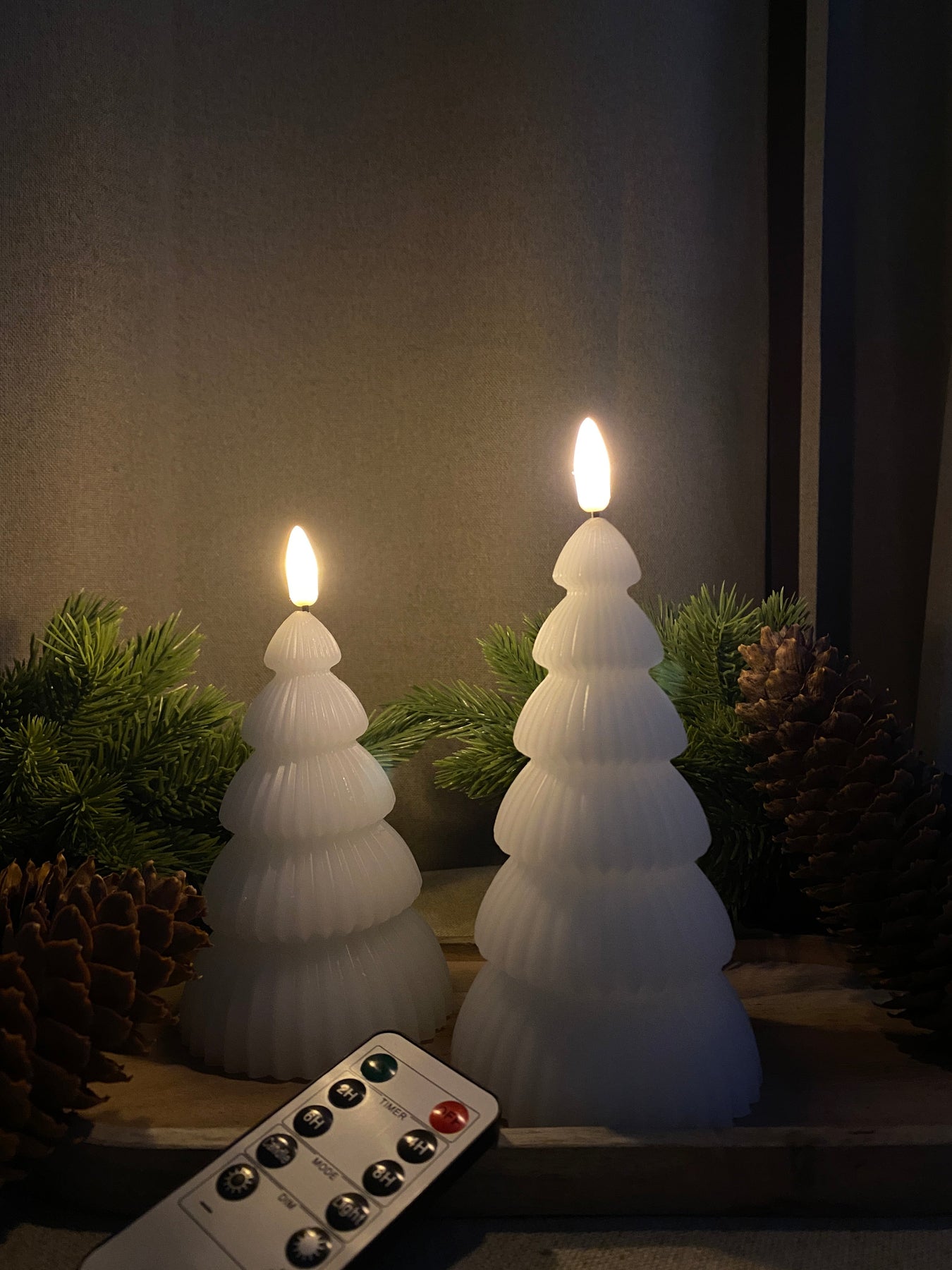 Skapa en mysig och varm julstämning med dessa LED-julgranar med realistisk 3D-flameffekt. De två olika höjderna möjliggör dekorativa kombinationer på bordet, fönsterbrädan eller hyllan. Ljusen är säkra och enkla att använda, och med den medföljande fjärrkontrollen kan du tända, släcka och styra flameffekten utan att behöva resa dig upp. Perfekt för att ge ditt hem en festlig och stämningsfull touch under julsäsongen.