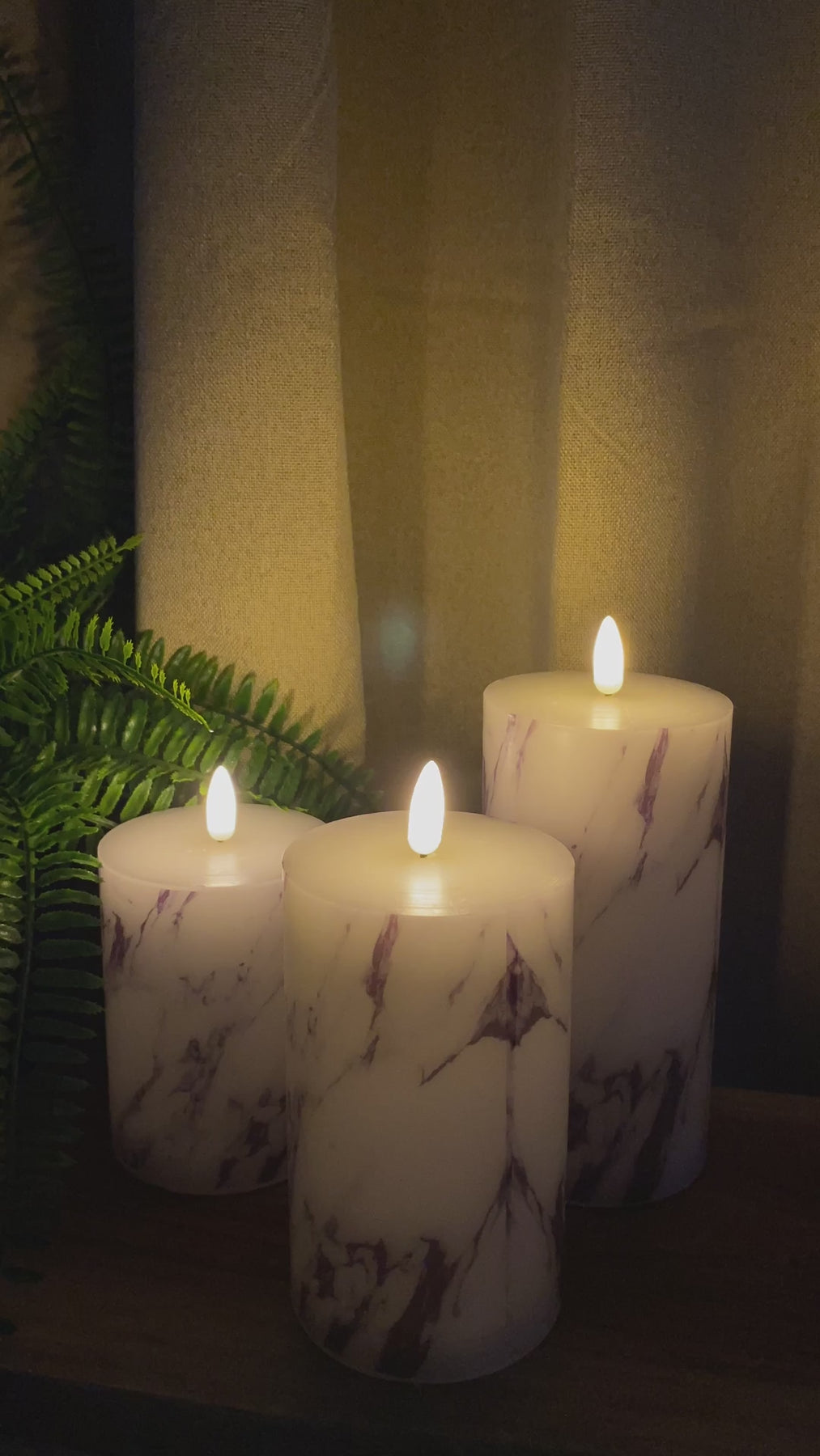 Denna uppsättning LED-vaxljus i marmorlook består av tre ljus i olika höjder (10 cm, 12,5 cm och 15 cm) och har en diameter på 7,5 cm. De är designade för att efterlikna det varma skenet från riktiga ljus, men utan risk för brand.