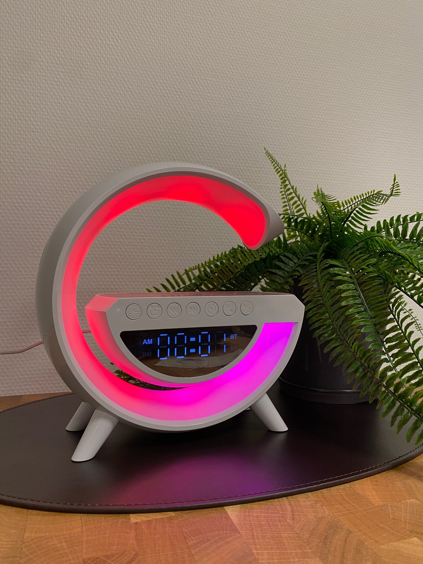 Denna snygga G-lampa kombinerar funktionalitet med modern design. Med måtten 24 x 23 x 8 cm passar den perfekt in i vilken inredning som helst. Lampan erbjuder trådlös laddning för dina enheter, så att du kan hålla dem laddade utan krångel. Samtidigt kan du njuta av din favoritmusik med den inbyggda Bluetooth-högtalaren som ger ett klart och fylligt ljud. Perfekt för både hem och kontor, där funktionalitet och estetik går hand i hand.