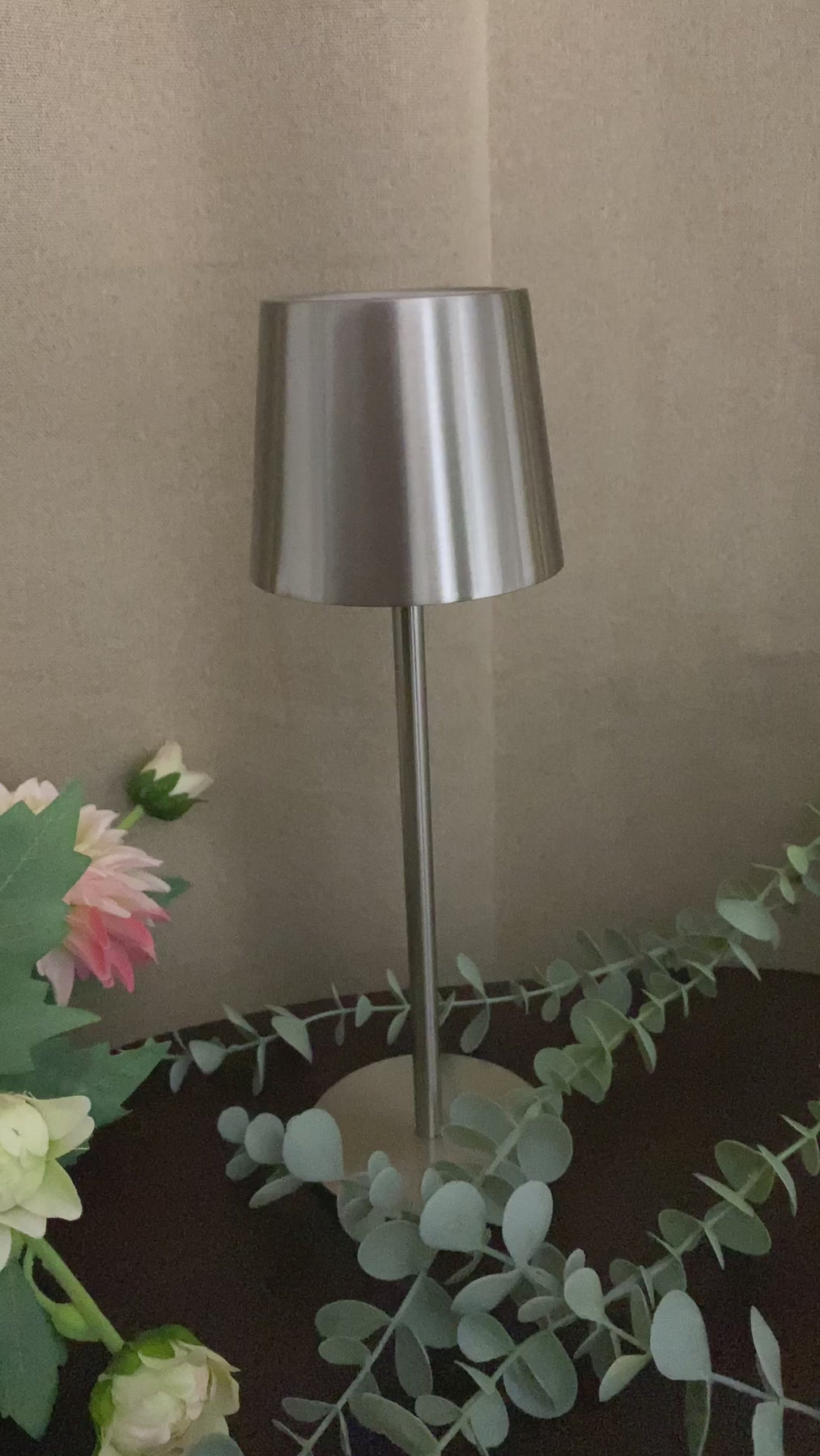 Denna eleganta silverfärgade bordslampa kombinerar modern design med praktisk funktionalitet. Den beröringsaktiverade lampan är uppladdningsbar och ger ett behagligt LED-ljus, perfekt för ditt skrivbord, nattduksbord eller som dekorativ belysning i ditt vardagsrum.