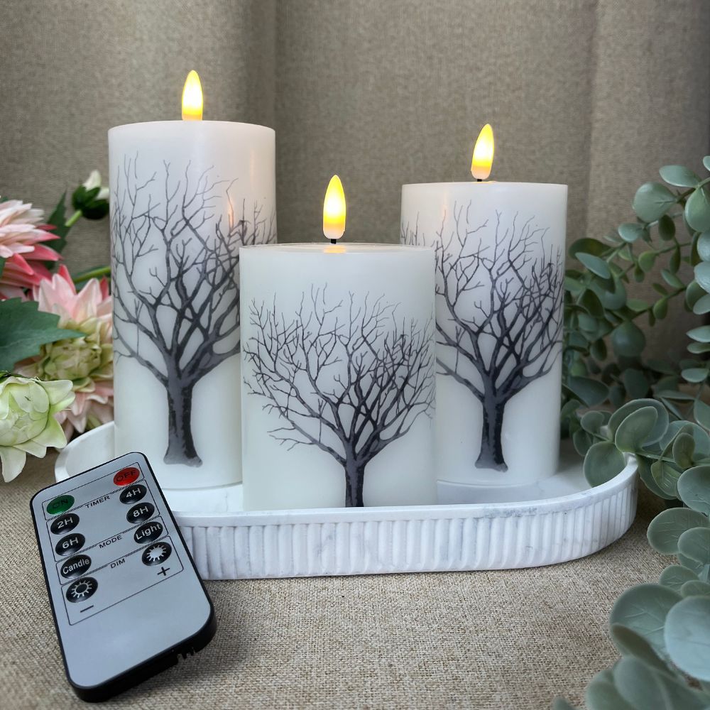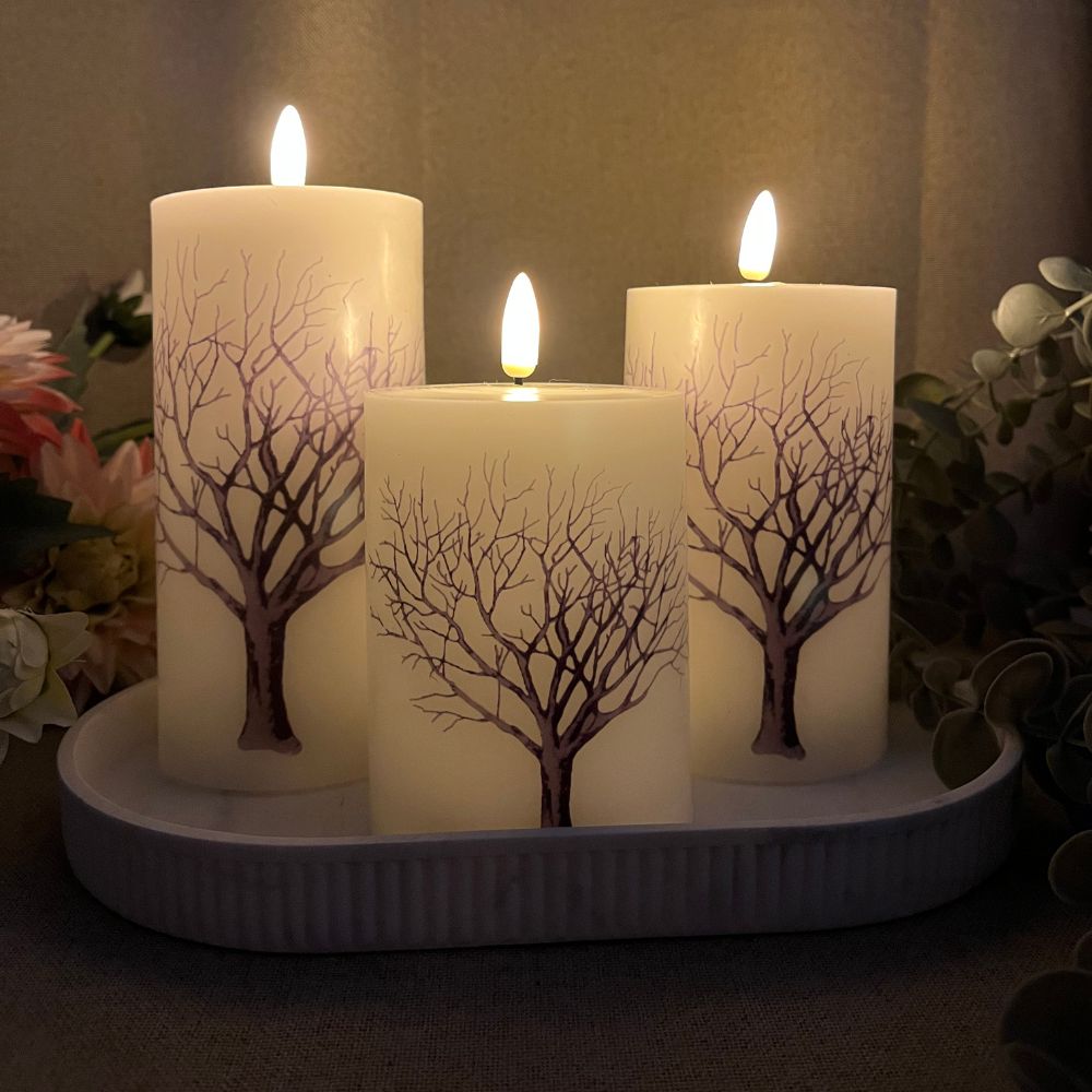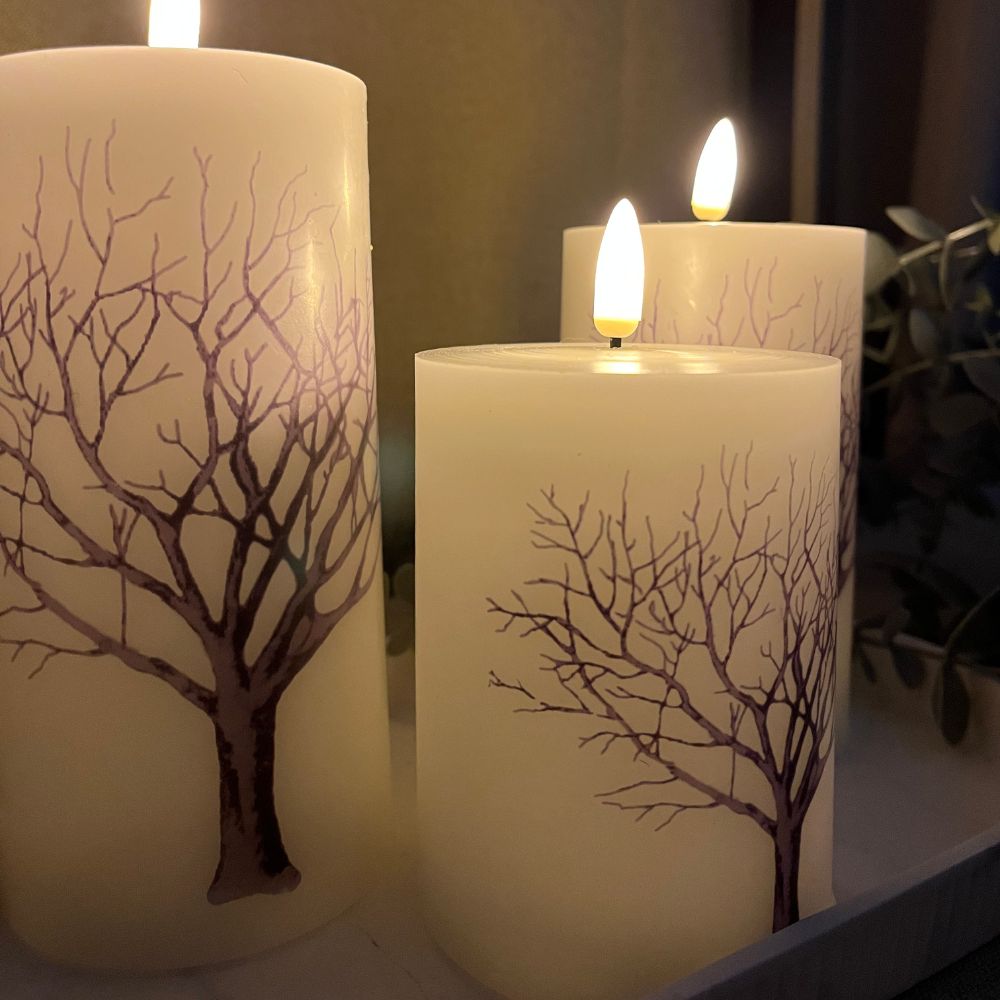 Varje ljus har en diameter på 7,5 cm och varierar i höjd: 10 cm, 12,5 cm och 15 cm. Perfekt för fönsterbrädor, myshörnor eller som dekorativ mittpunkt på matbordet. Drivs av batterier - utan sot och brandrisk, men med samma stämningsfulla effekt som riktiga ljus.