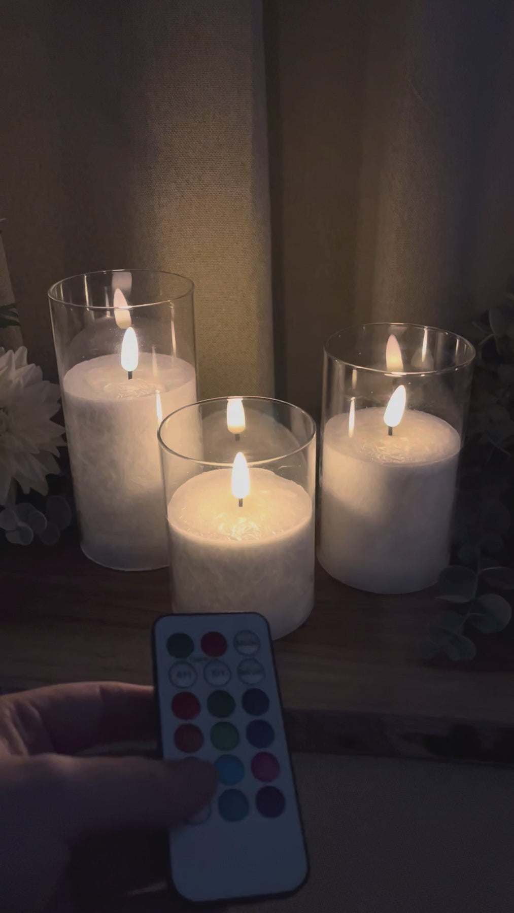 Detta LED-cylinderglasset ger dig både mysighet och flexibilitet i din inredning. De tre lamporna i olika höjder har en realistisk 3D-flameffekt, vilket skapar en varm och livlig atmosfär – utan rök, sot eller brandrisk. Med den medföljande fjärrkontrollen med 18 knappar kan du enkelt växla mellan olika färger, ställa in timers och justera ljusfunktioner, så att du får exakt den atmosfär du vill ha. Lamporna kan användas året runt och är perfekta för både festliga tillfällen och vardaglig dekoration.