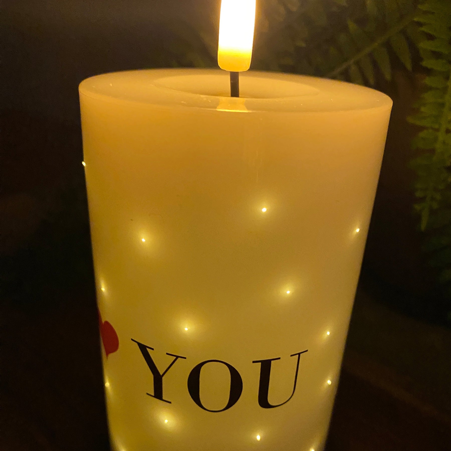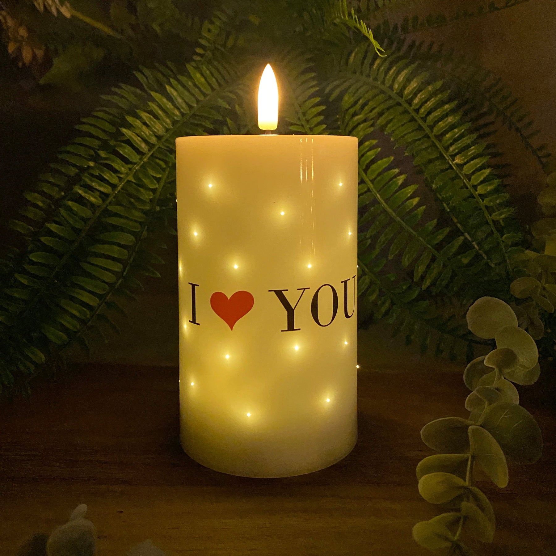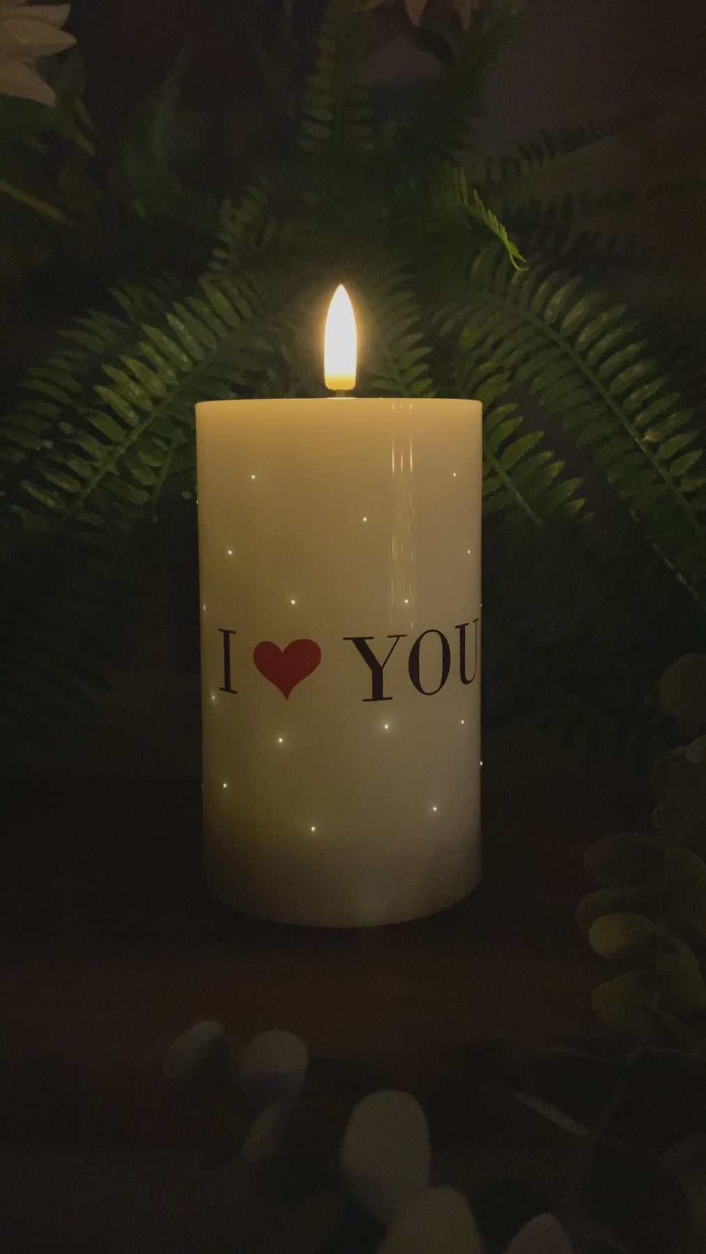 Visa din kärlek på det mest atmosfäriska sättet med denna romantiska LED-lampa med glimteffekt och "I LOVE YOU"-motiv . Ljuset avger ett varmt och mjukt sken som påminner om riktiga ljus – perfekt för att skapa en mysig och kärleksfull atmosfär.
