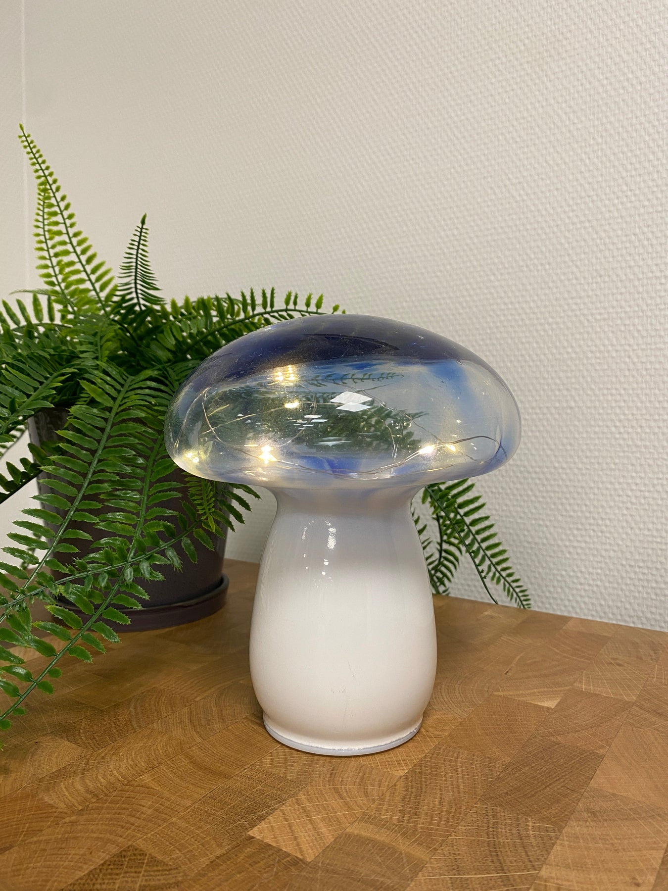 Toadstool-lampan är utrustad med LED-belysning inuti, vilket skapar ett mjukt och mysigt sken. Den blå glaskupan ger lampan en varm och inbjudande nyans som skapar en mysig atmosfär i alla rum.