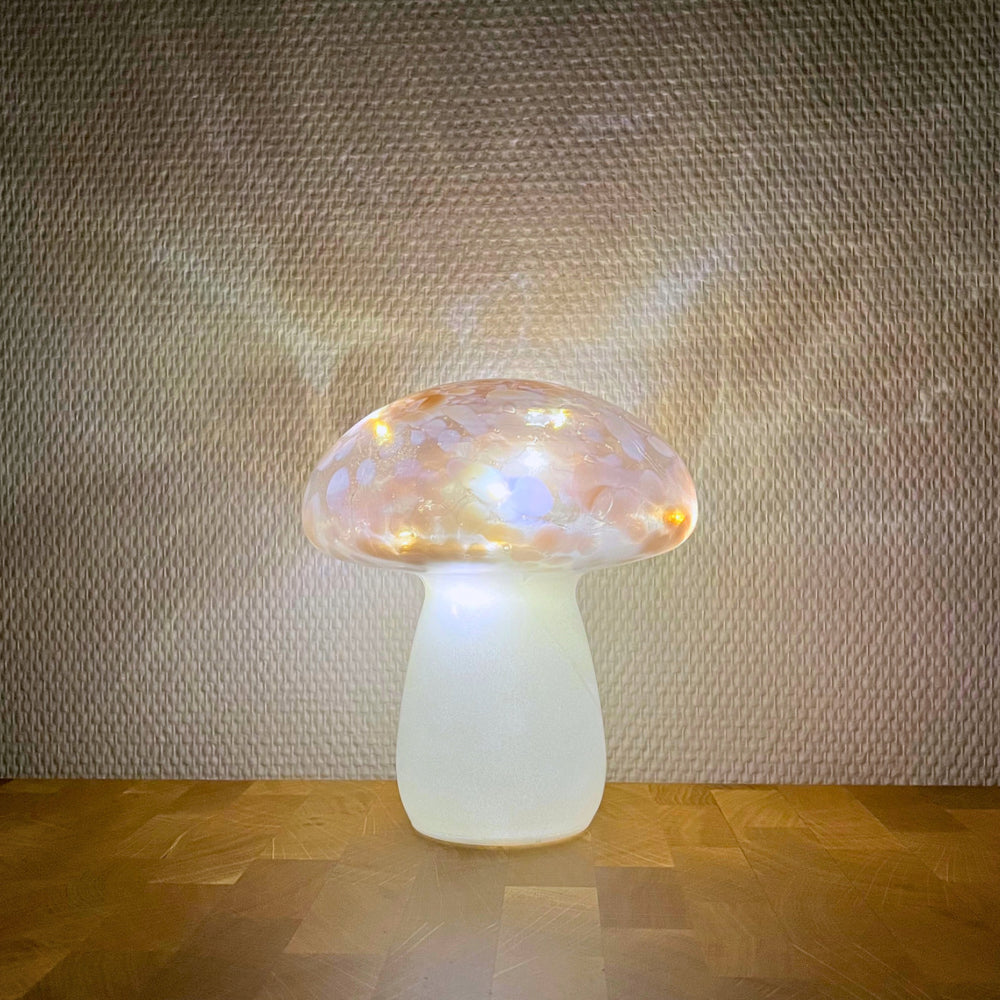 Svamplampan är utrustad med LED-belysning inuti, vilket skapar ett mjukt och mysigt sken. Kupolen i roséglas ger lampan en varm och inbjudande nyans som skapar en mysig atmosfär i alla rum.