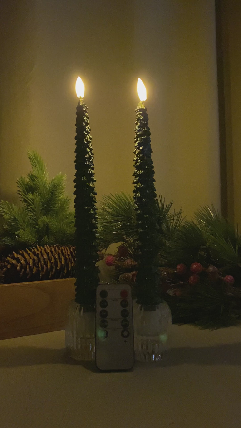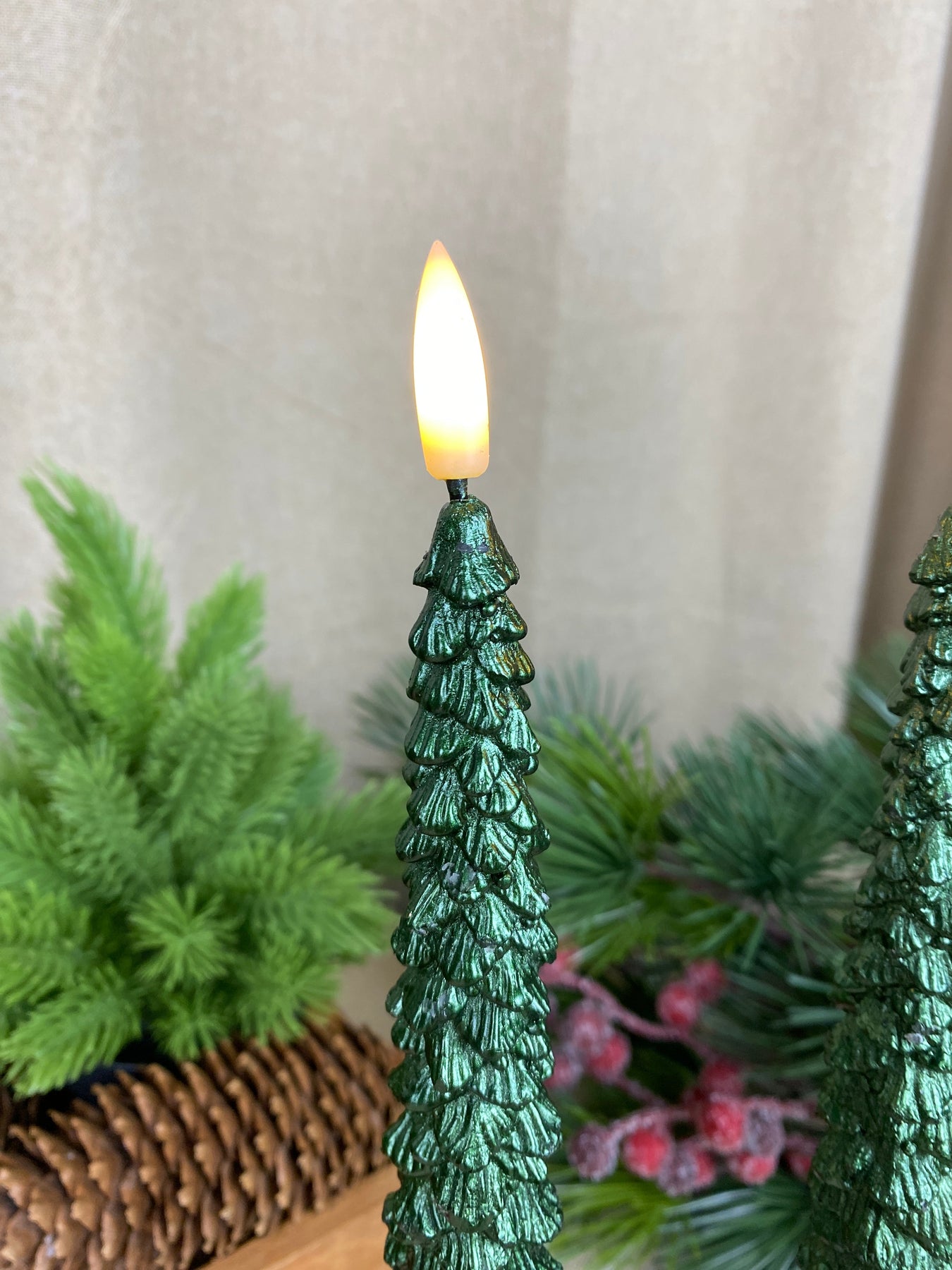 Ge din juldekoration en elegant och stämningsfull look med dessa LED-ljusstakar i julgransdesign . Ljusen är gjorda av riktigt grönt vax och har en realistisk 3D-låga som rör sig som ett riktigt ljus – utan rök, sot eller brandrisk.