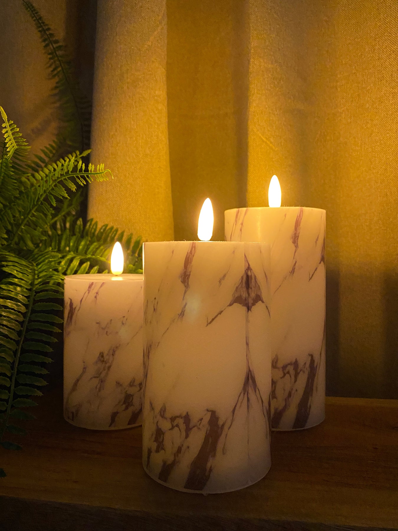 Denna uppsättning LED-vaxljus i marmorlook består av tre ljus i olika höjder (10 cm, 12,5 cm och 15 cm) och har en diameter på 7,5 cm. De är designade för att efterlikna det varma skenet från riktiga ljus, men utan risk för brand.