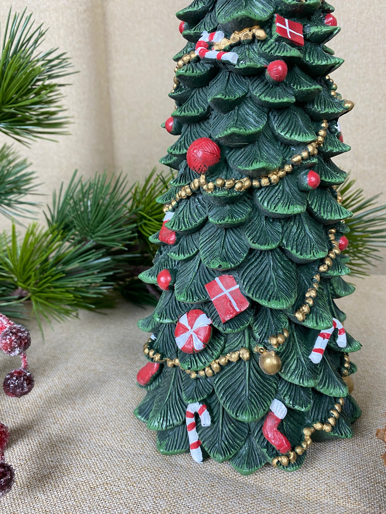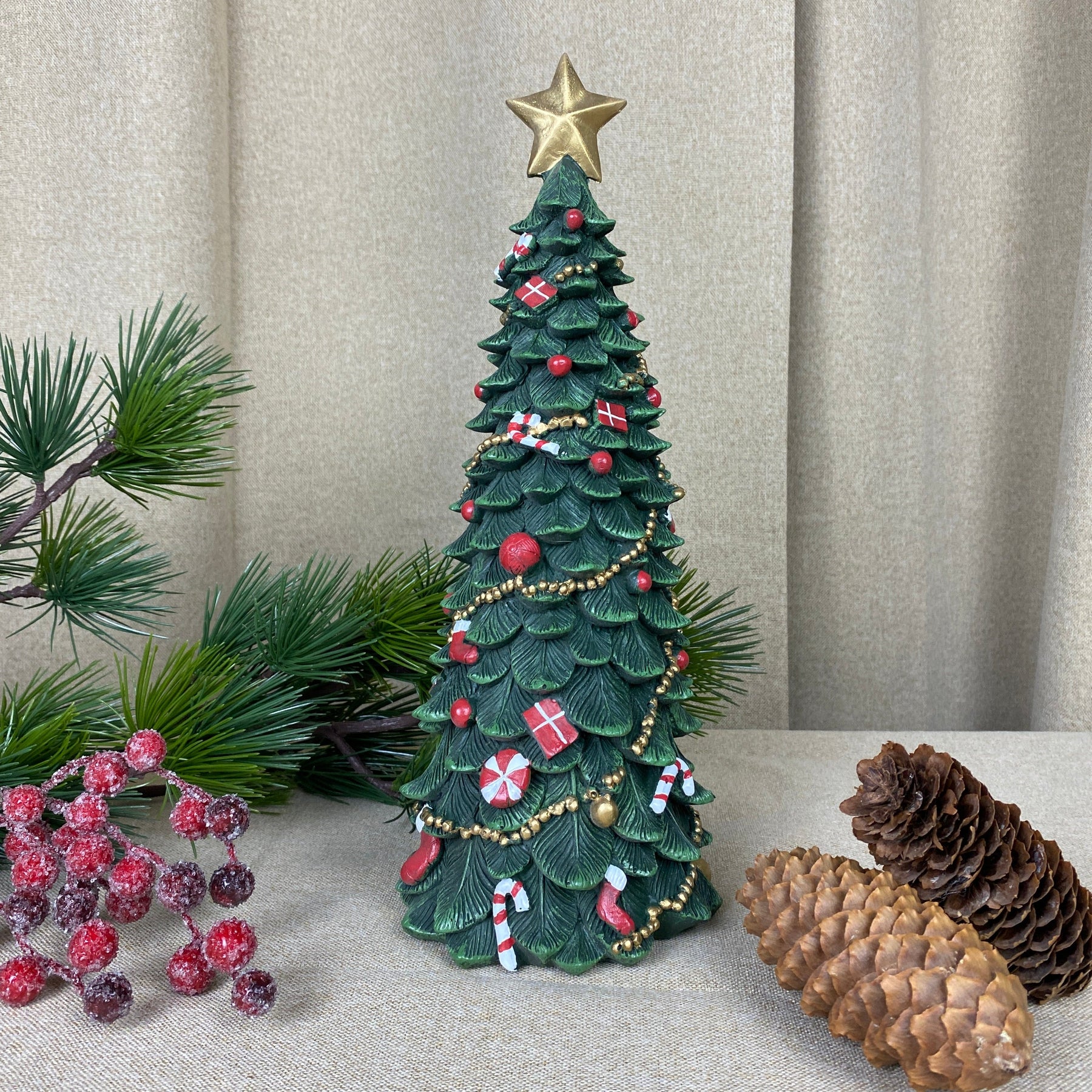 Denna vackra julgransfigur i mörkgrön polyresin är dekorerad och redo att sprida julstämning i ditt hem. Med sin kompakta höjd på 33 cm passar den perfekt på bordet, i fönsterbrädan eller på hyllan och kan kombineras med andra juldekorationer för en mysig och festlig look. Robust material säkerställer att figurinen kan användas år efter år som en klassisk del av din juldekoration.