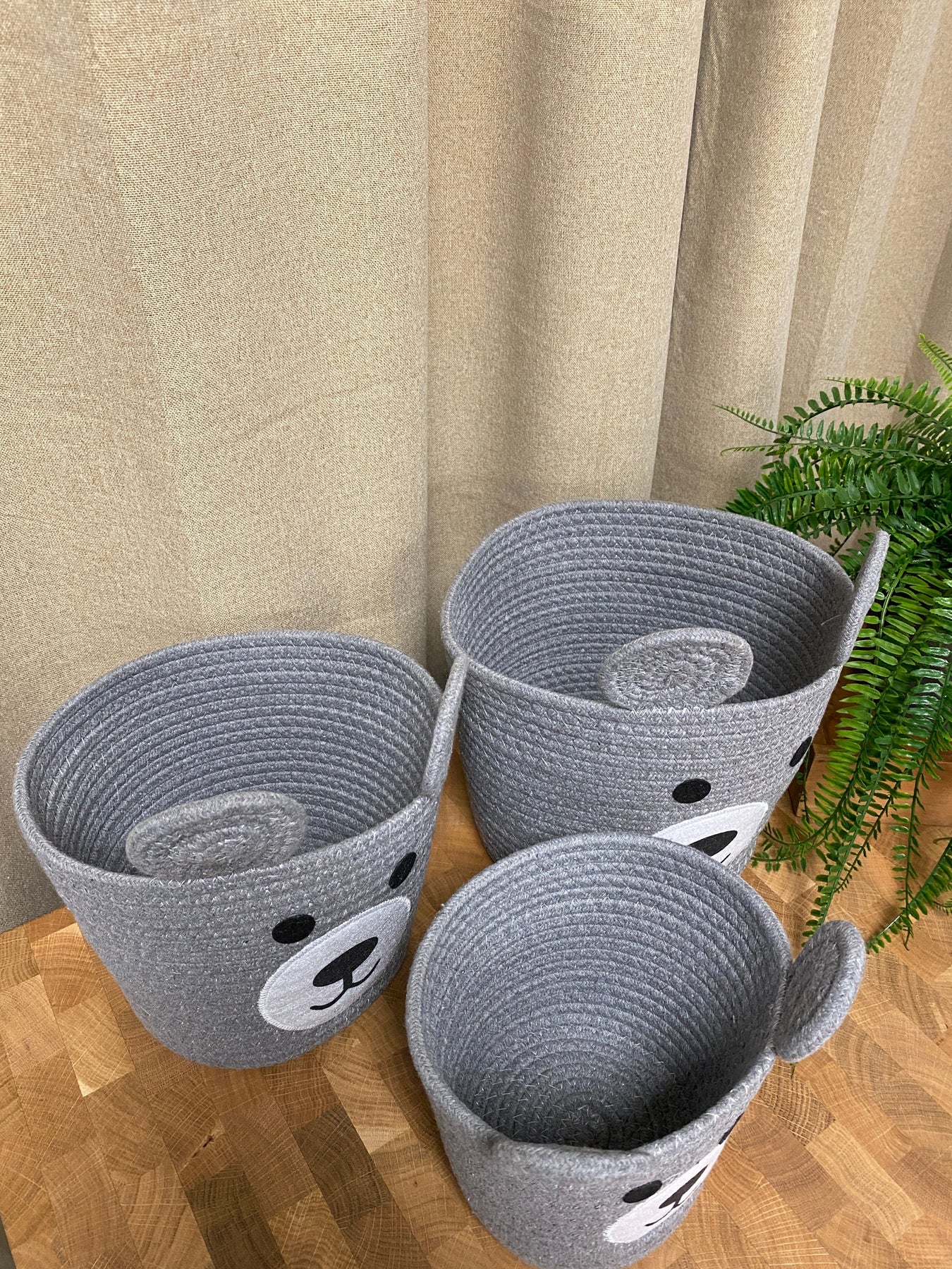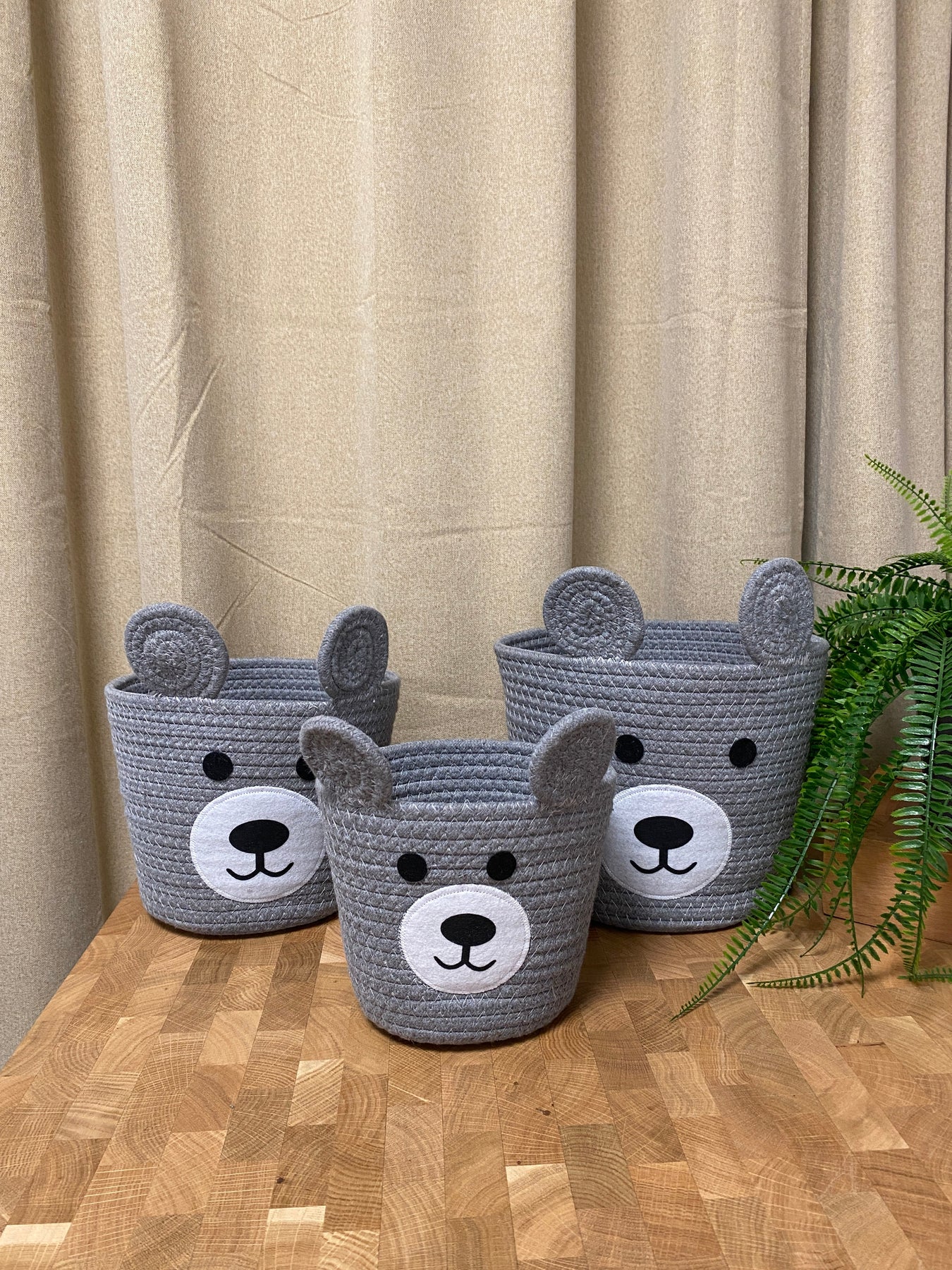 Detta korgset med öron består av tre vackert designade korgar som kombinerar funktionalitet med ett charmigt björnmotiv. Korgarna har praktiska handtag (öron), som gör dem lätta att transportera, och de är perfekta för förvaring av småsaker, leksaker, kläder eller andra hushållsartiklar. Den grå designen med det söta björnmotivet ger en mysig och inbjudande look som passar in i vilken heminredning som helst.