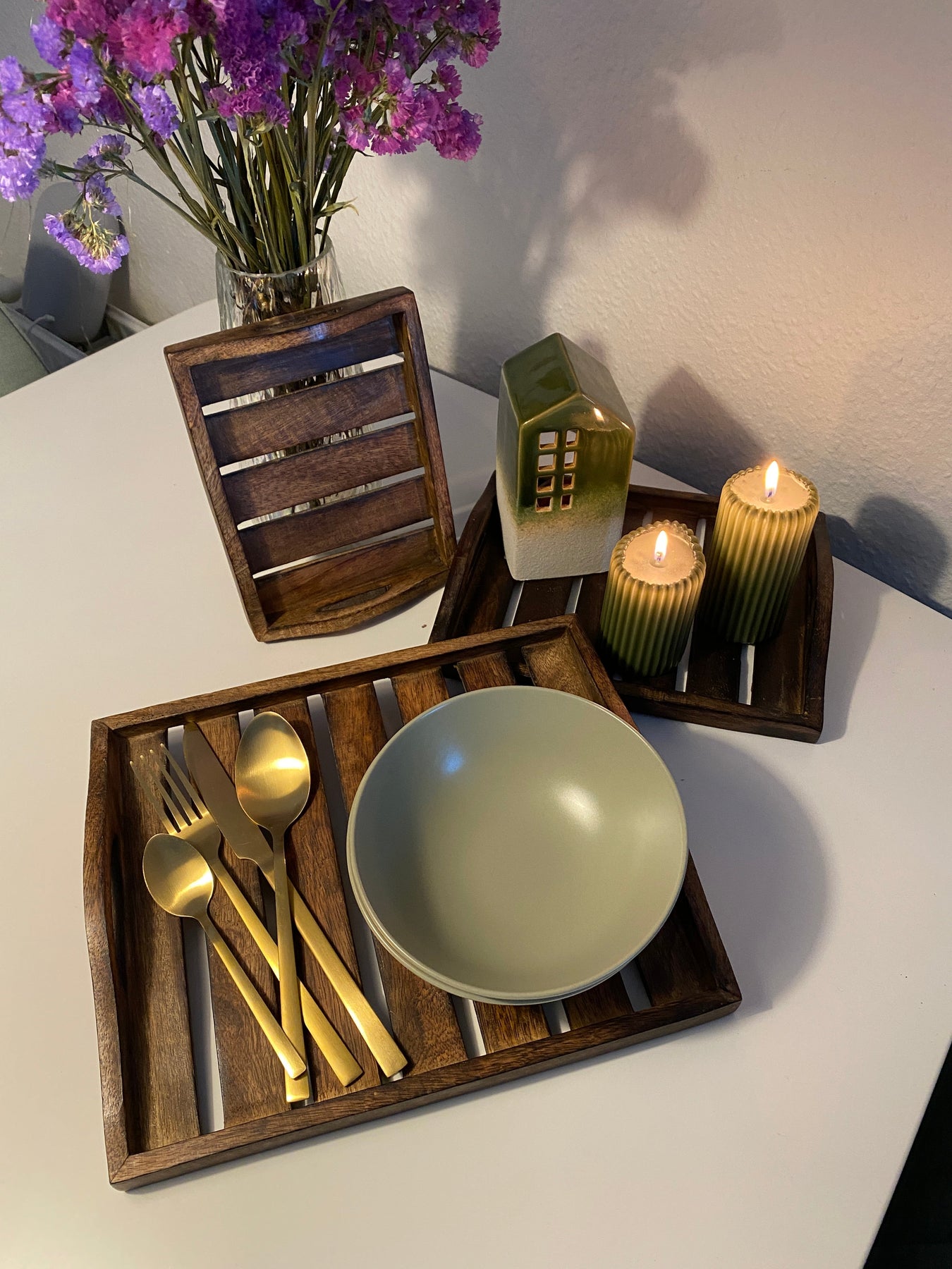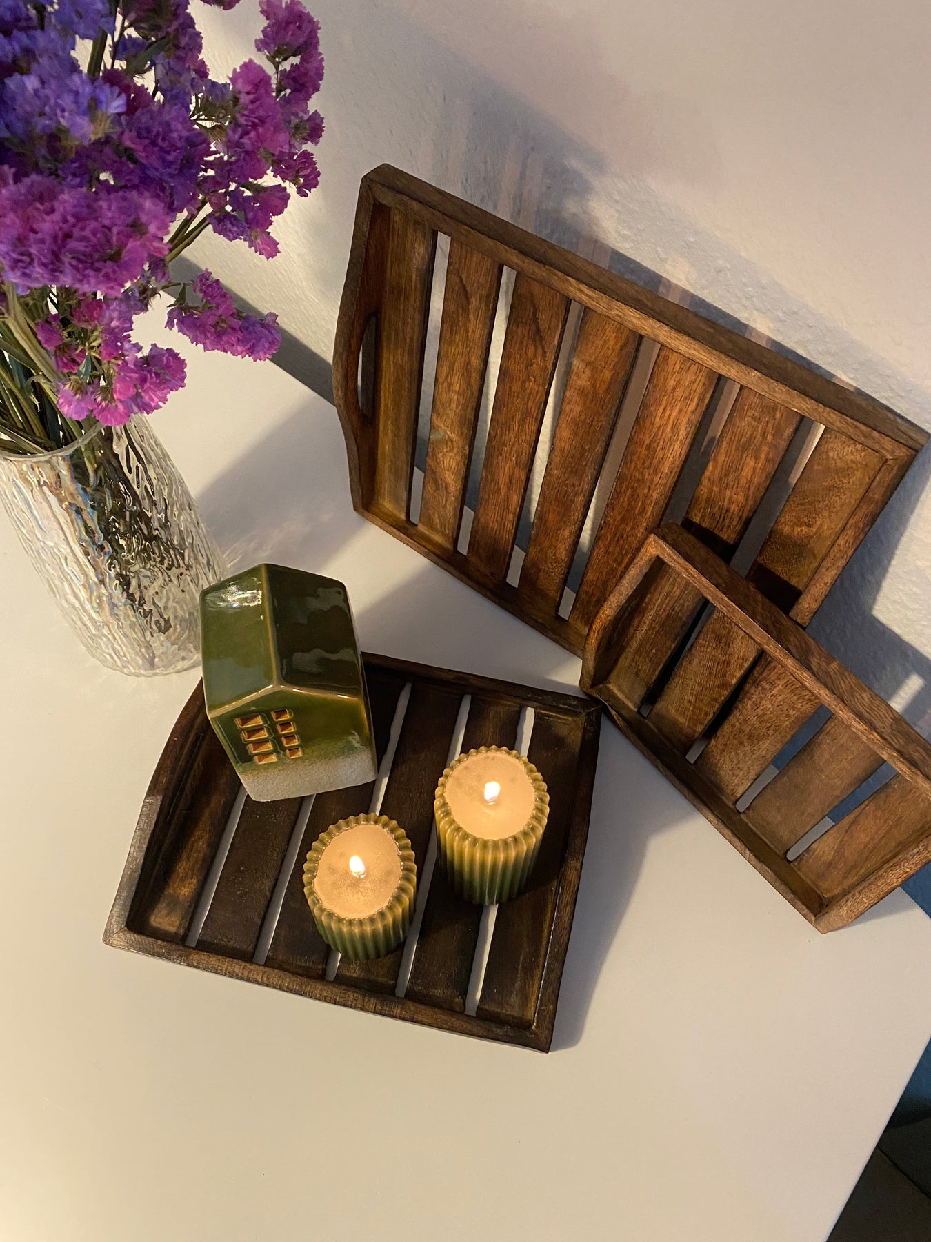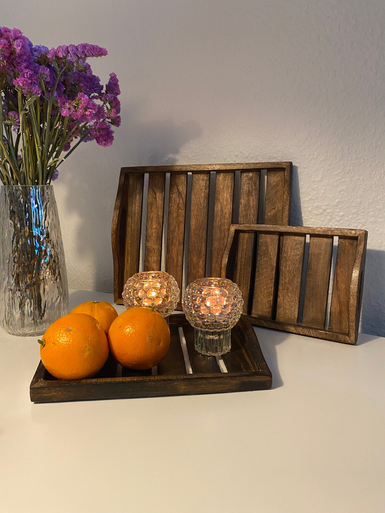 Detta vackra brickset i mörkbrunt trä är både praktiskt och dekorativt. Använd dem som dekorativa fat för ljus eller säsongsbetonade dekorationer, i köket för kryddor och oljor, eller i badrummet för att hålla krämer och parfymer organiserade och inbjudande. De tre olika storlekarna ger dig flexibilitet i användningen – varje bricka anpassar sig elegant till dina behov och utrymme. Skapa lugn, ordning och estetik med denna tidlösa