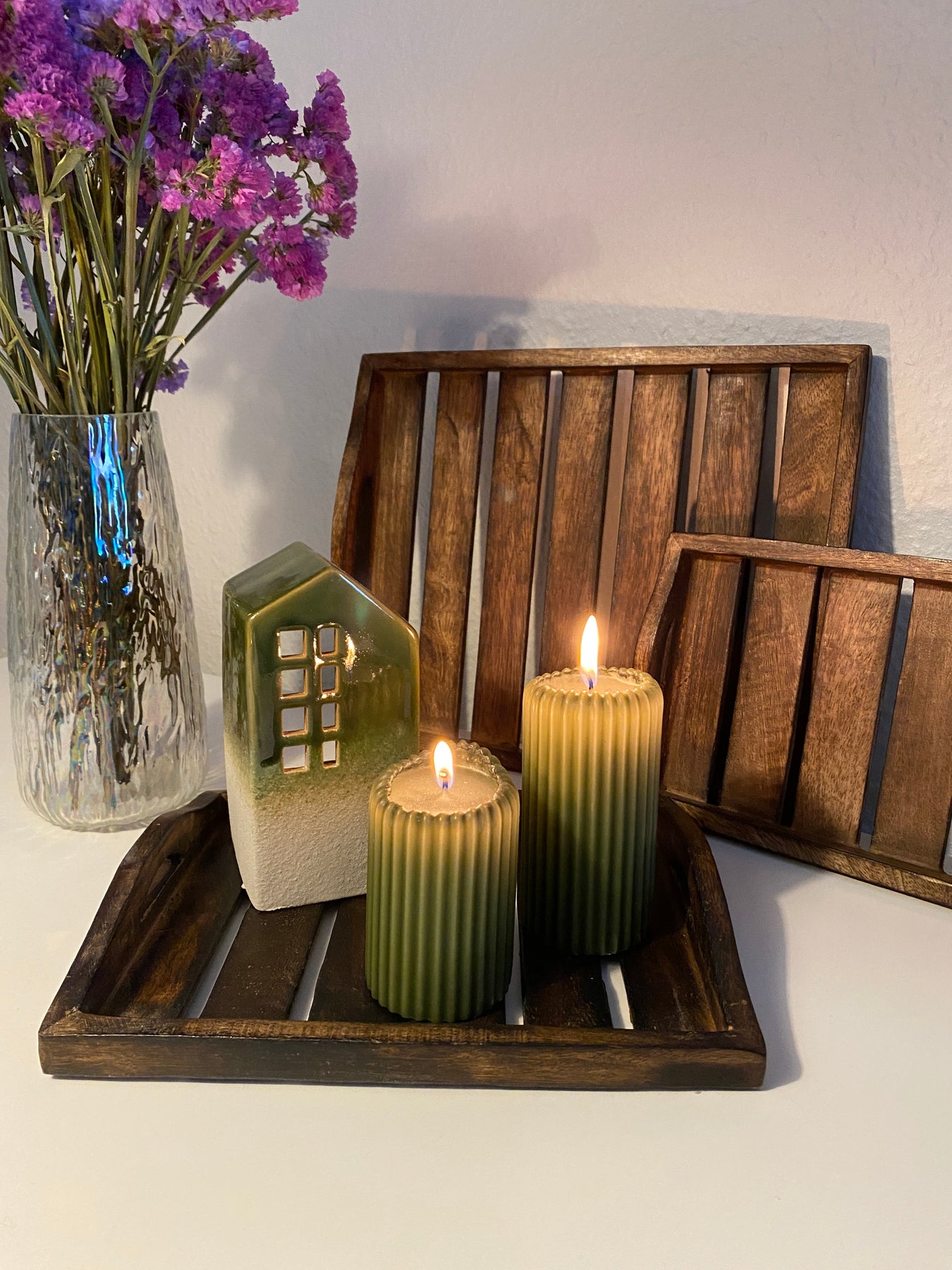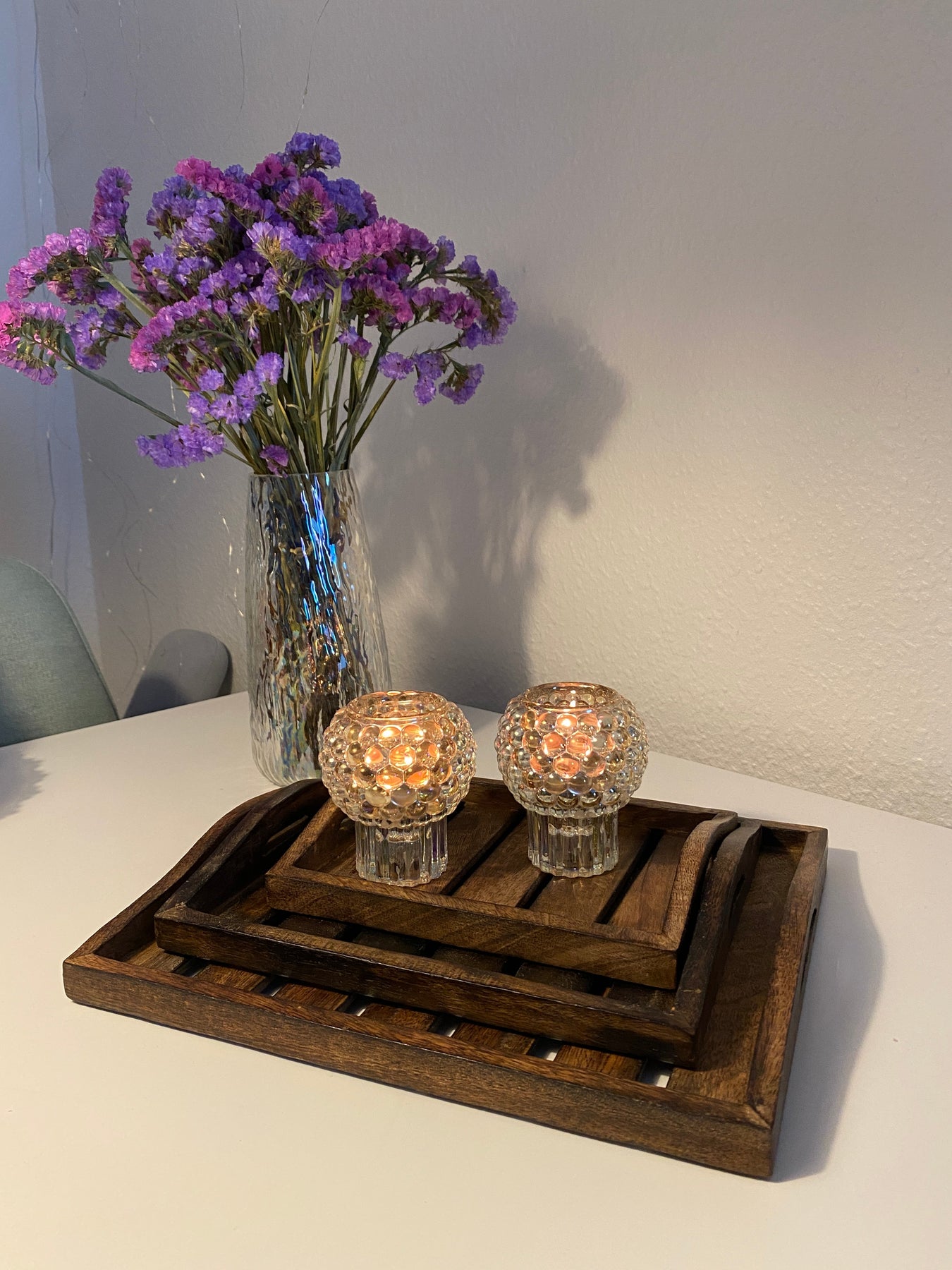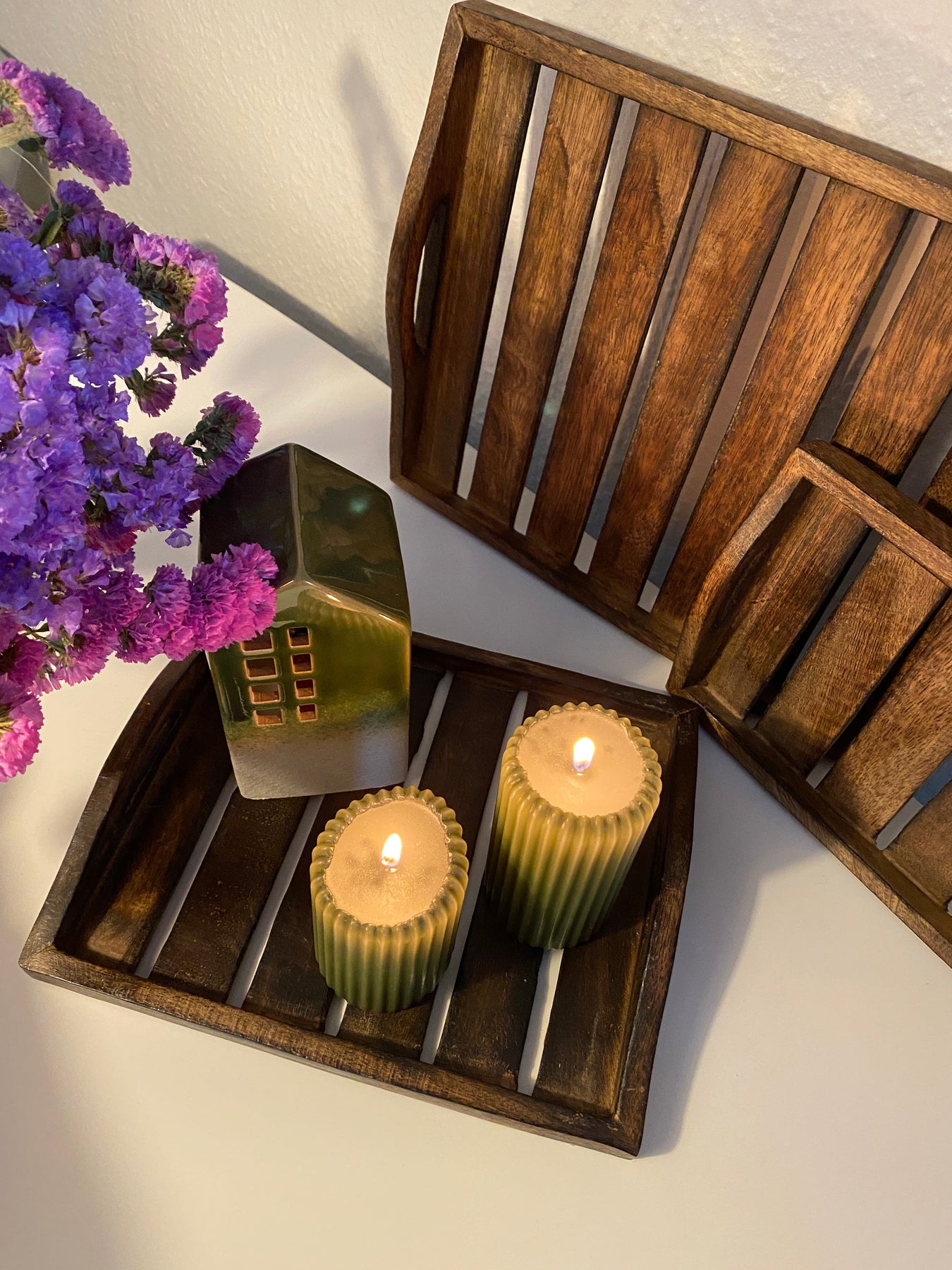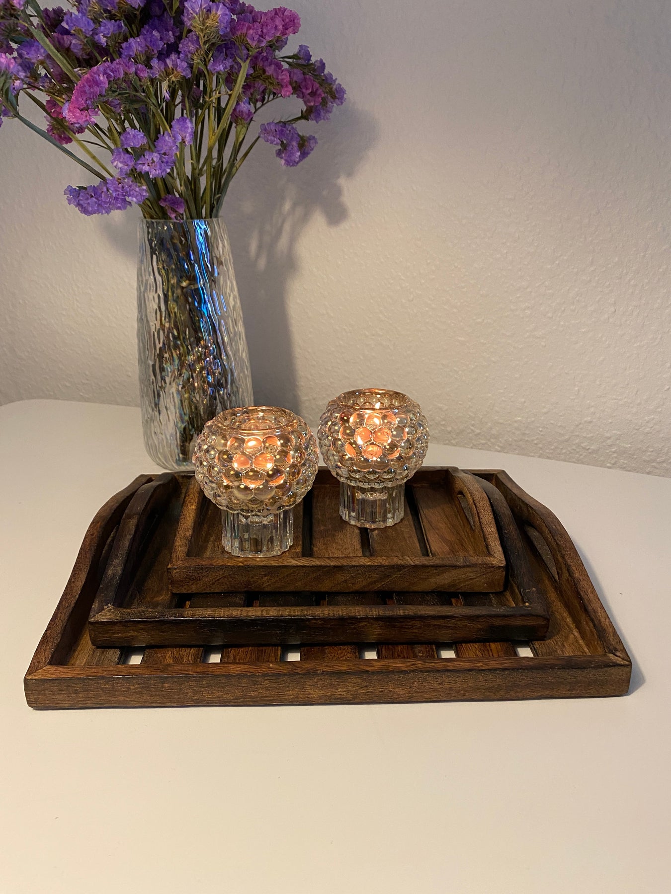 Detta vackra brickset i mörkbrunt trä är både praktiskt och dekorativt. Använd dem som dekorativa fat för ljus eller säsongsbetonade dekorationer, i köket för kryddor och oljor, eller i badrummet för att hålla krämer och parfymer organiserade och inbjudande. De tre olika storlekarna ger dig flexibilitet i användningen – varje bricka anpassar sig elegant till dina behov och utrymme. Skapa lugn, ordning och estetik med denna tidlösa