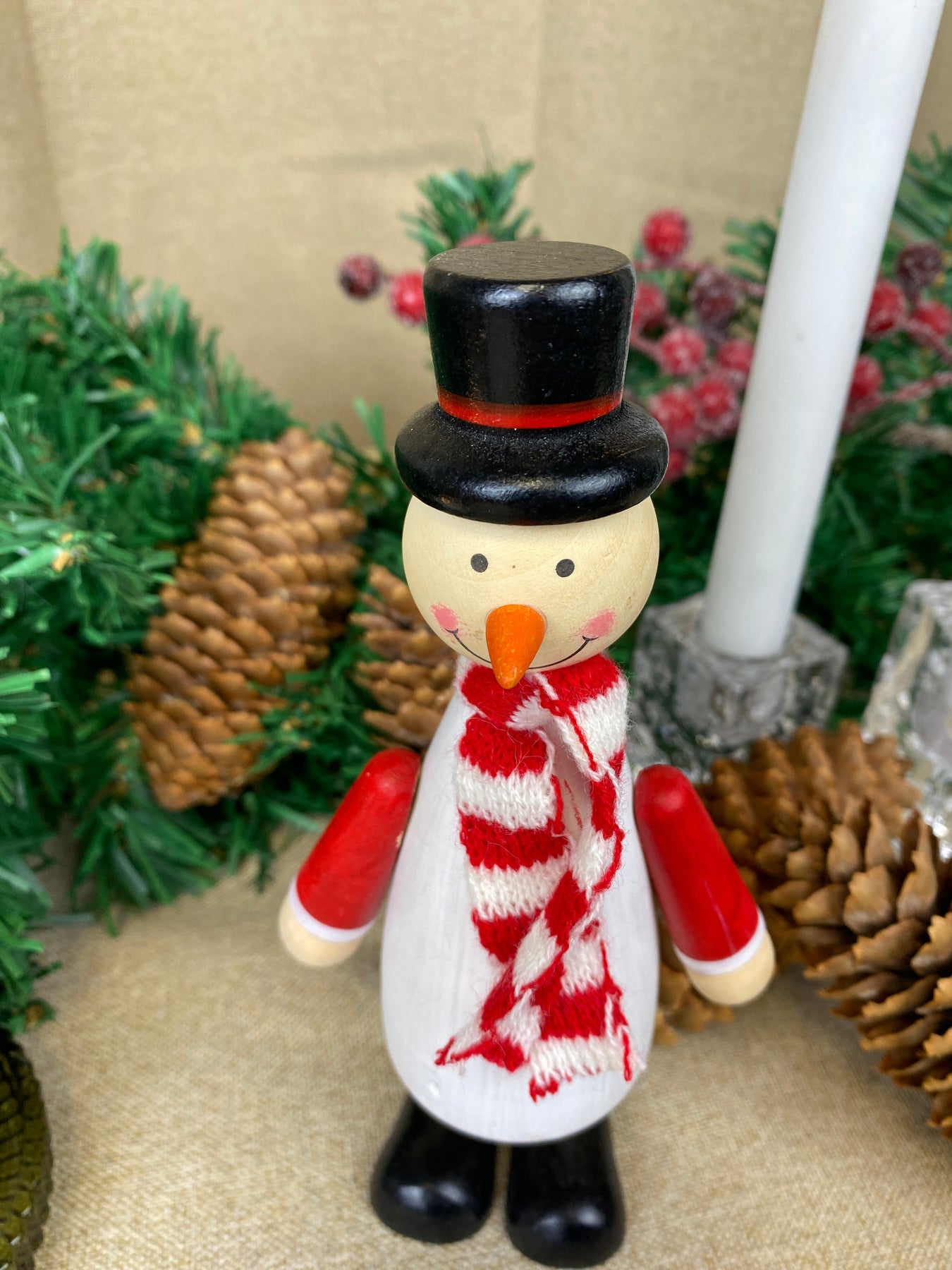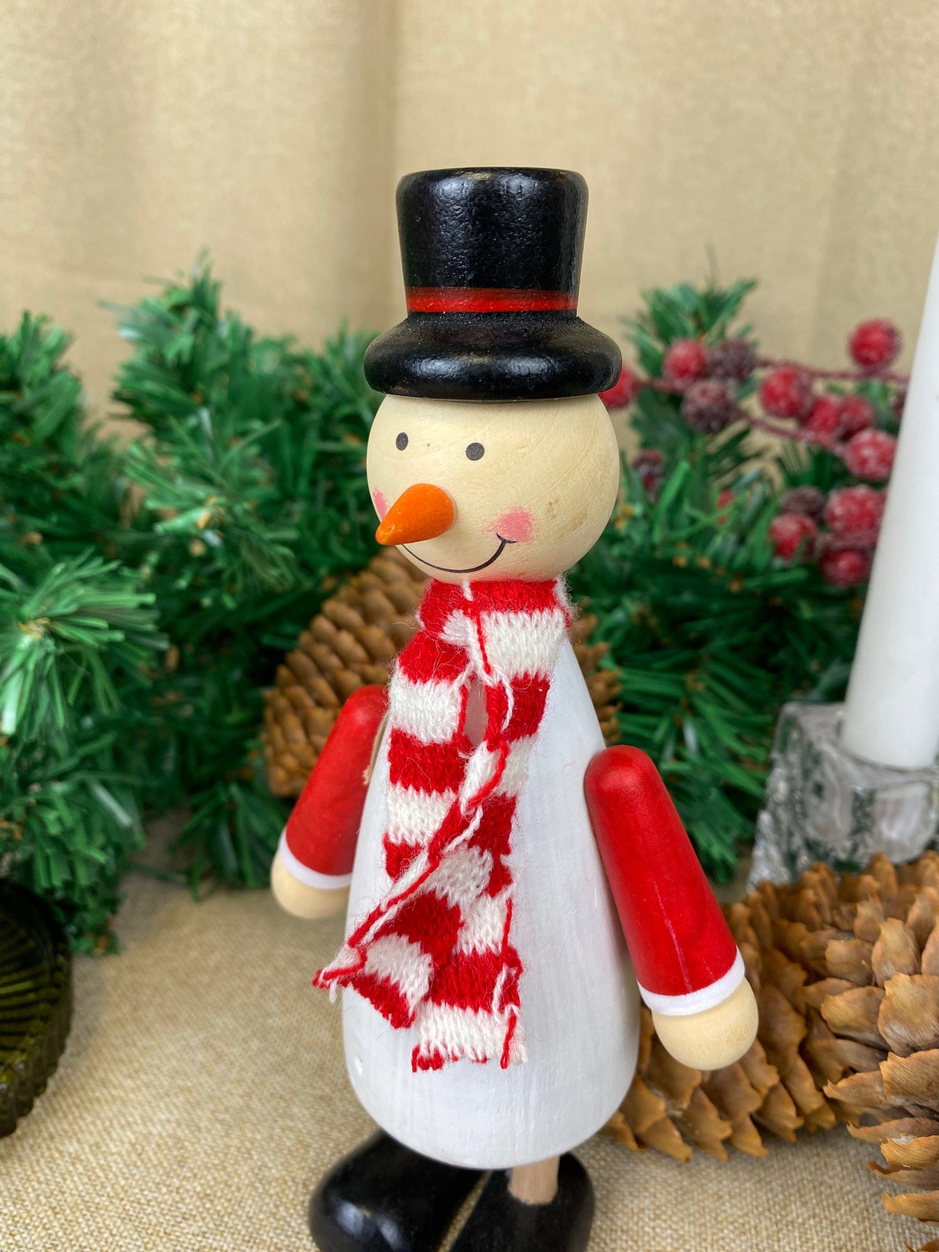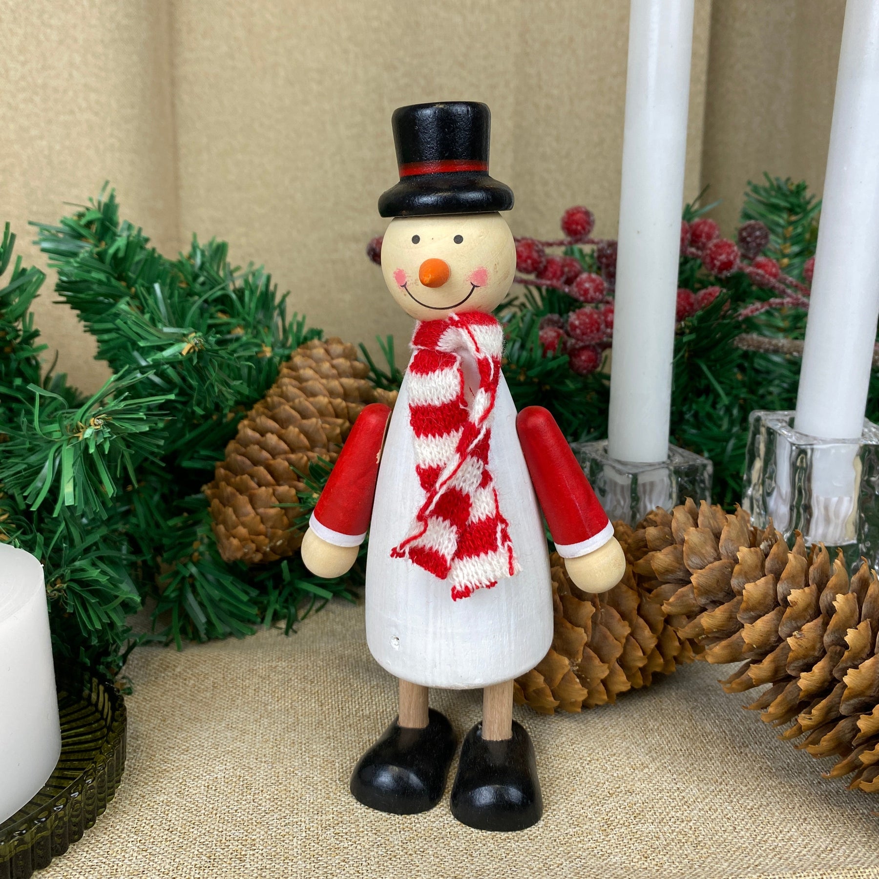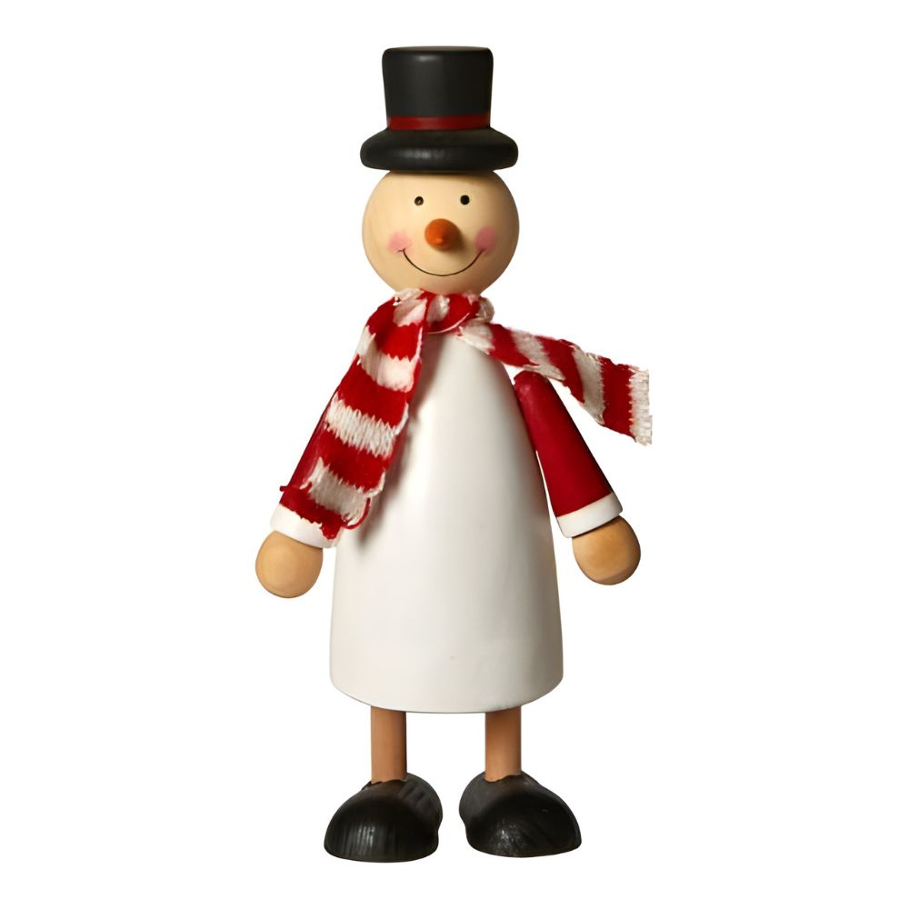 Dekorativ snögubbe tillverkad av furuträ målad vit och prydd med en liten halsduk, vilket ger figurens uttryck extra charm och personlighet. Den fina kombinationen av naturligt trä och klassiska julfärger skapar en mysig och nordisk julstämning.
