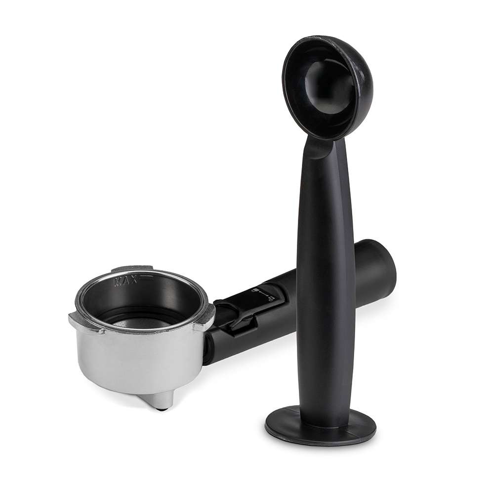• Inkluderar portafilter, filter för 1 och 2 koppar, mätsked med åtgärd och liten mjölkkanna i rostfritt stål