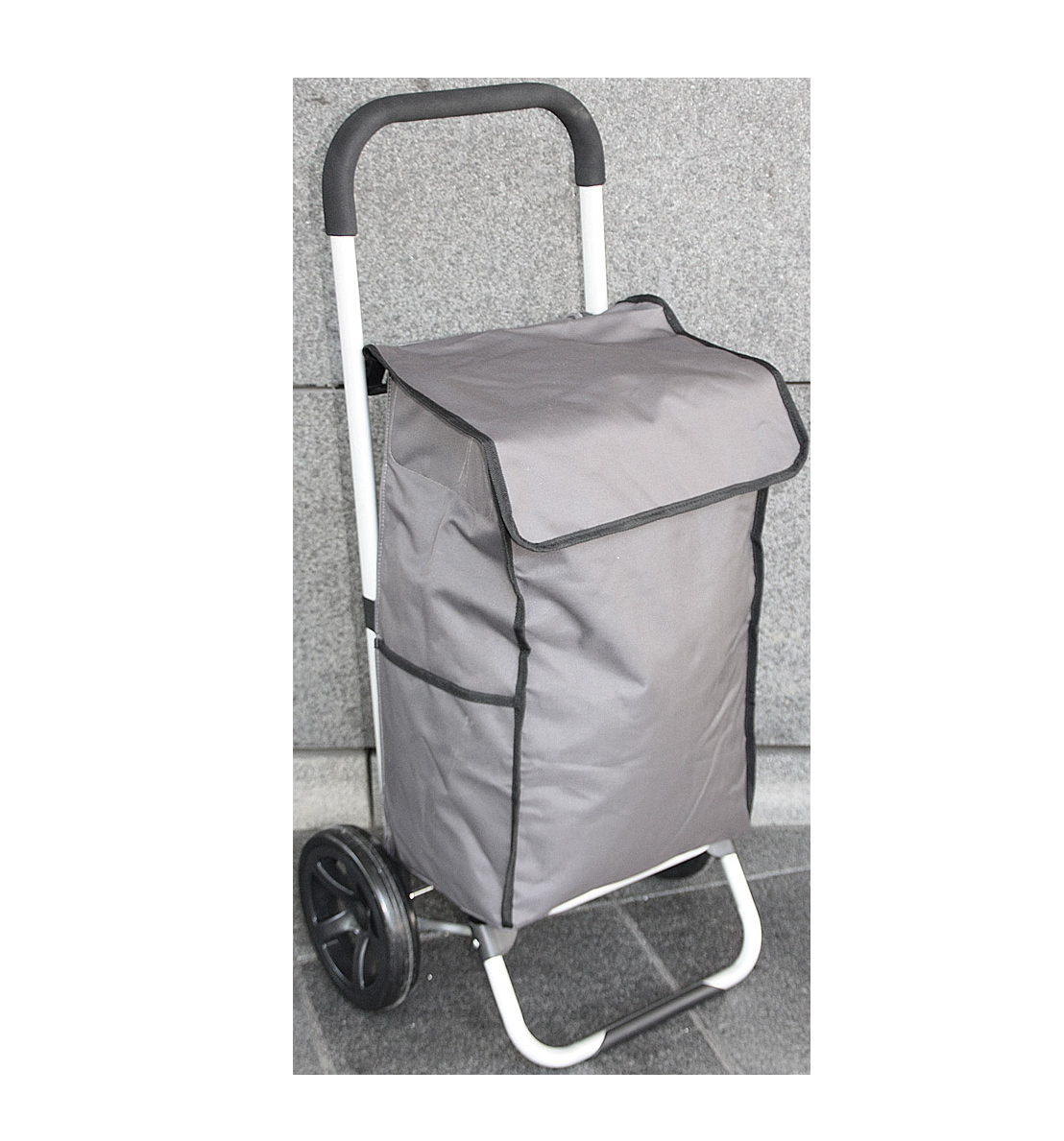 Vagnen är utrustad med lättrullande hjul som gör den enkel att manövrera i snabbköpet eller på gatan. Handtaget är ergonomiskt utformat och ger ett bekvämt grepp så att du kan dra vagnen utan att anstränga dig.
