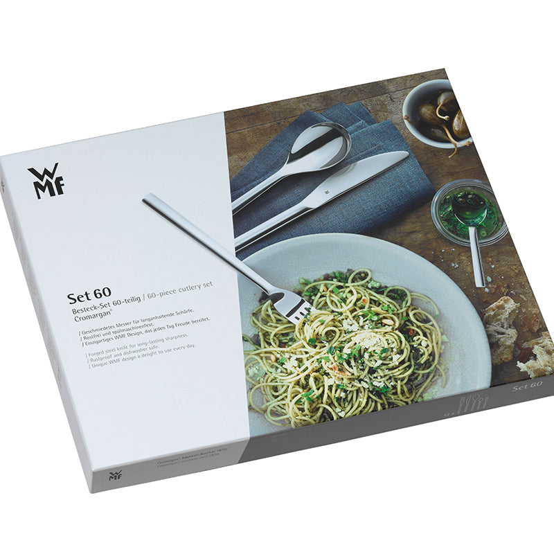 WMF levererar återigen en bra produkt till ett bra pris! Den här gången är det den vackra bestickuppsättningen "Philadelphia". Besticksetet består av 60 delar (12 gafflar, 12 knivar, 12 skedar, 12 teskedar och 12 tårtgafflar).