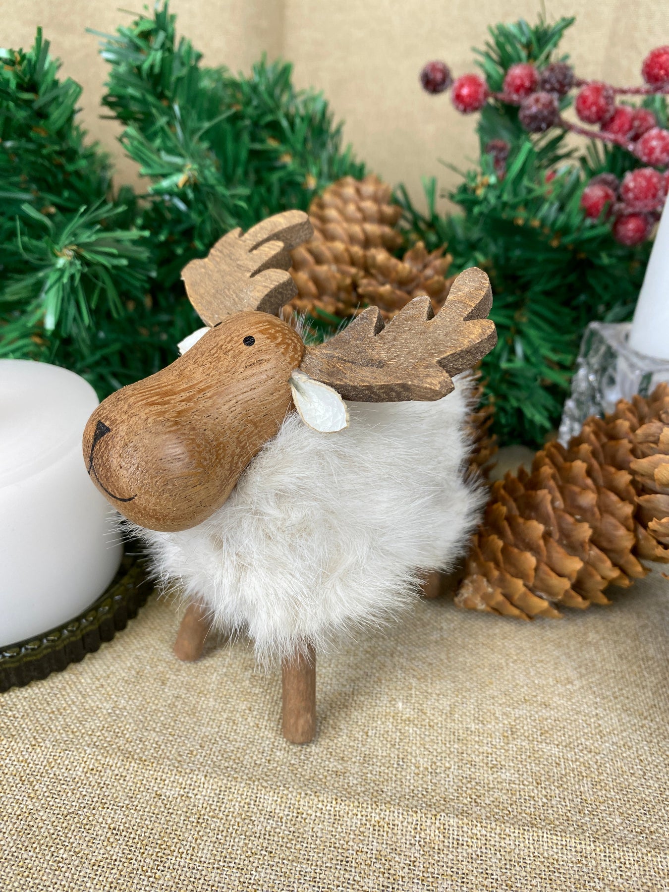 Söt älg med mjuk päls i vit färg - perfekt som en mysig och dekorativ detalj i din inredning. Figuren kombinerar träets naturliga utseende med polyesterpälsens mjuka och mysiga textur, vilket ger ett varmt och charmigt utseende.