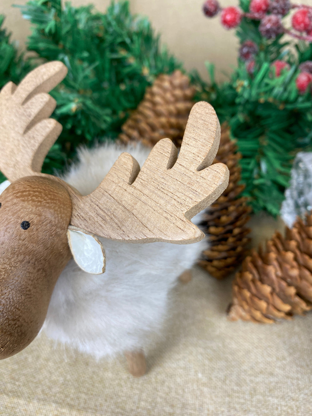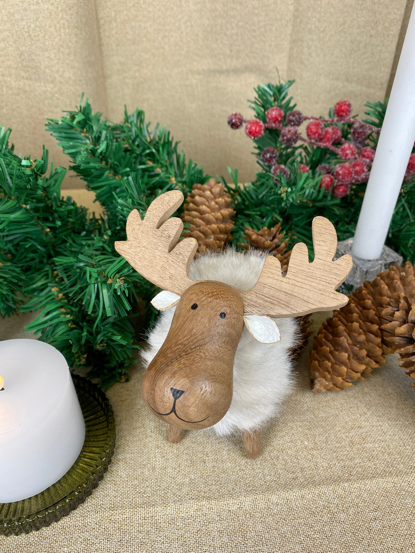 Söt älg med mjuk päls i vit färg - perfekt som en mysig och dekorativ detalj i din inredning. Figuren kombinerar träets naturliga utseende med polyesterpälsens mjuka och mysiga textur, vilket ger ett varmt och charmigt utseende.