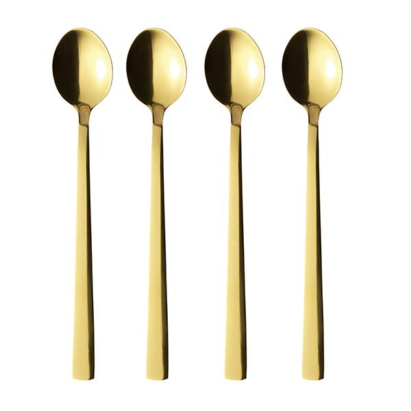 Det finns 4 AIDA - RAW cafe latte skedar totalt. i guld ett elegant och praktiskt tillskott för alla kaffedrickare eller kaféägare som vill sätta lite extra stil på sin kaffedricksupplevelse.
