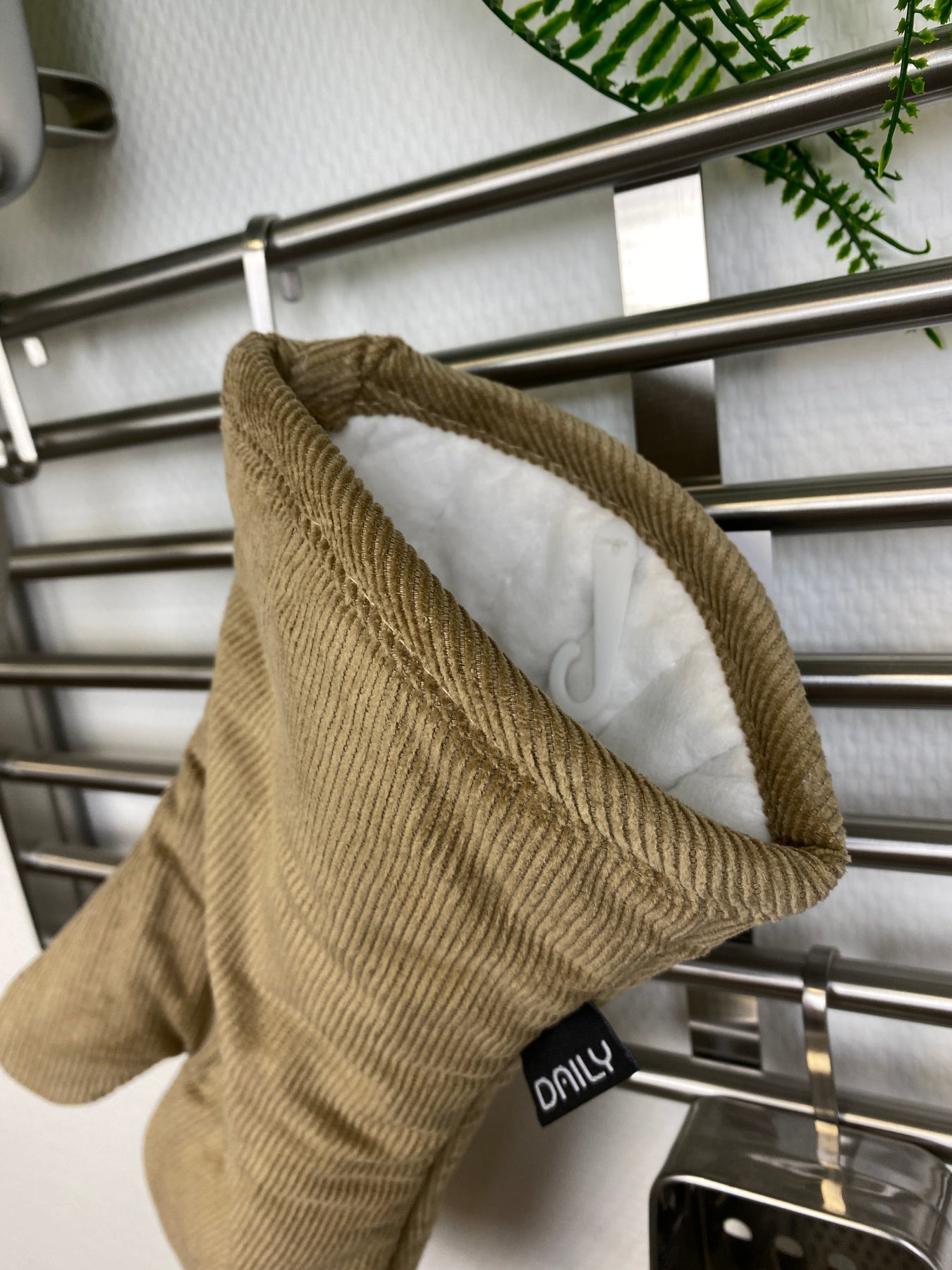 En bra, tjock grillhandske tillverkad av mjukt sammetsmaterial som ger dig nödvändigt skydd vid hantering av varma rätter, grytor eller grillar.