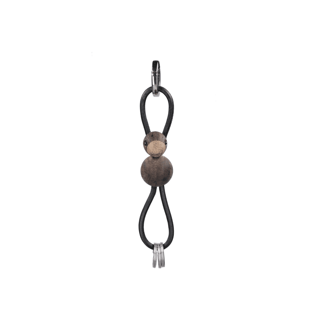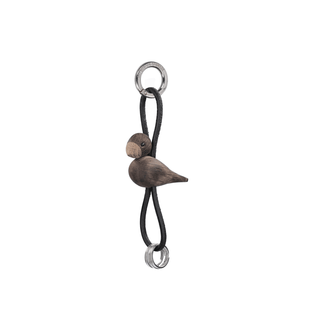 Denna eleganta nyckelring kombinerar Kay Bojesens ikoniska sångfågel med funktionell design för vardagsbruk. Figuren är tillverkad av FSC®-certifierad rökt ek och monterad med ett svart lädersnöre som du kan justera för att skapa ett personligt uttryck. Den stora silverfärgade ringen är både vackert graverad med Kay Bojesen Danmark och praktiskt utrustad med en karbinhake, så den enkelt kan fästas på en väska, bälte eller nyckelring. Under fågeln hänger tre extra nyckelringar, vilket ger dig plats för alla dina nycklar. Ett snyggt designobjekt i miniatyrformat som låter dig ta med dig original dansk design – varje dag.