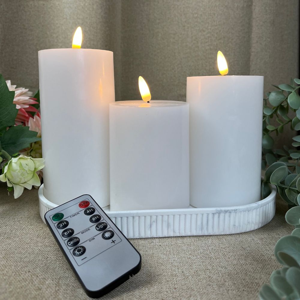 LED-blockljus - Set om 3 i vitt med fjärrkontroll är den perfekta lösningen för att skapa stämning och inreda ditt hem med ljus. De är idealiska för både inomhusbruk och som en del av dina festliga bordsdukningar eller dekorativa inredningselement.