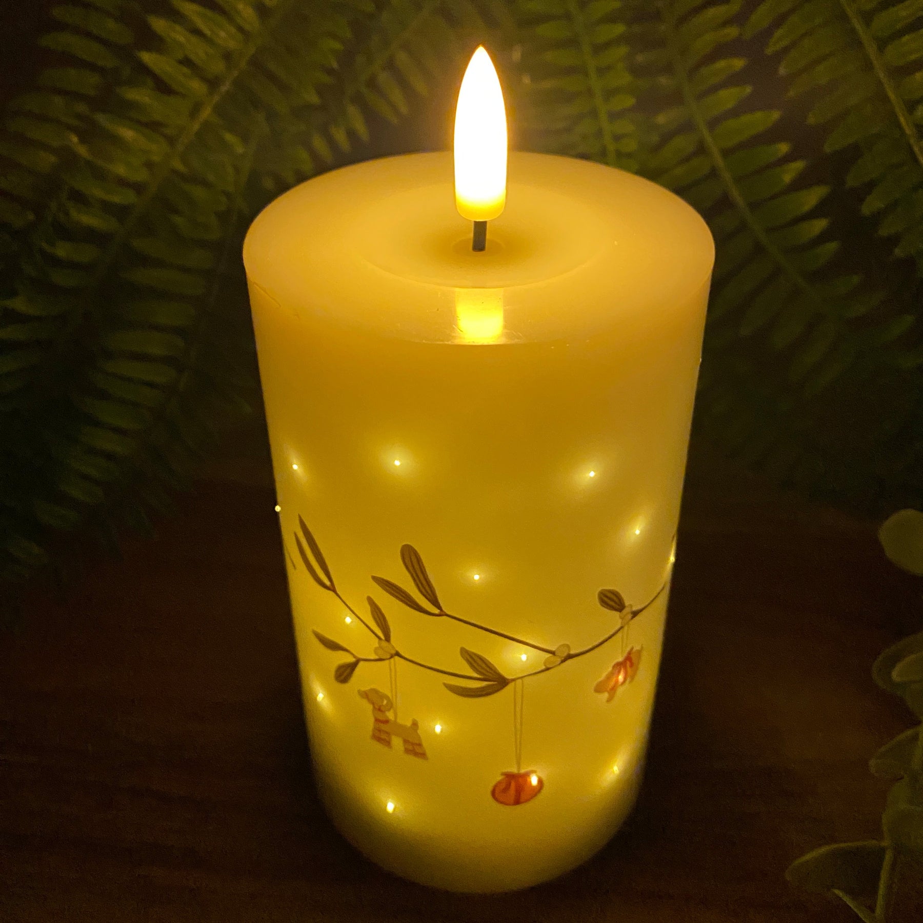 Skapa en mysig och romantisk julstämning med denna vackra LED-lampa med glimteffekt och mistelmotiv . Ljuset har en verklighetstrogen, fladdrande låga som ger ett varmt och vibrerande sken - helt utan rök, sot eller brandrisk.