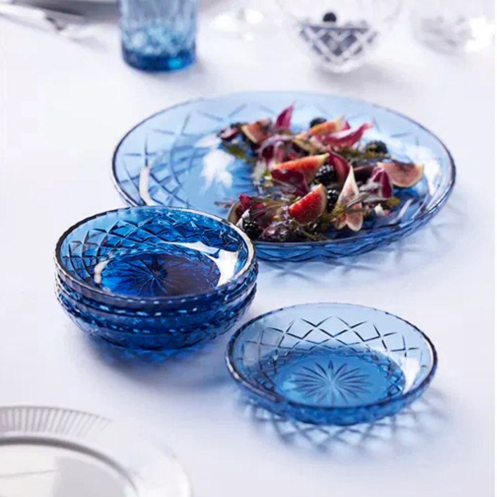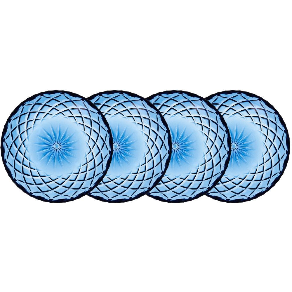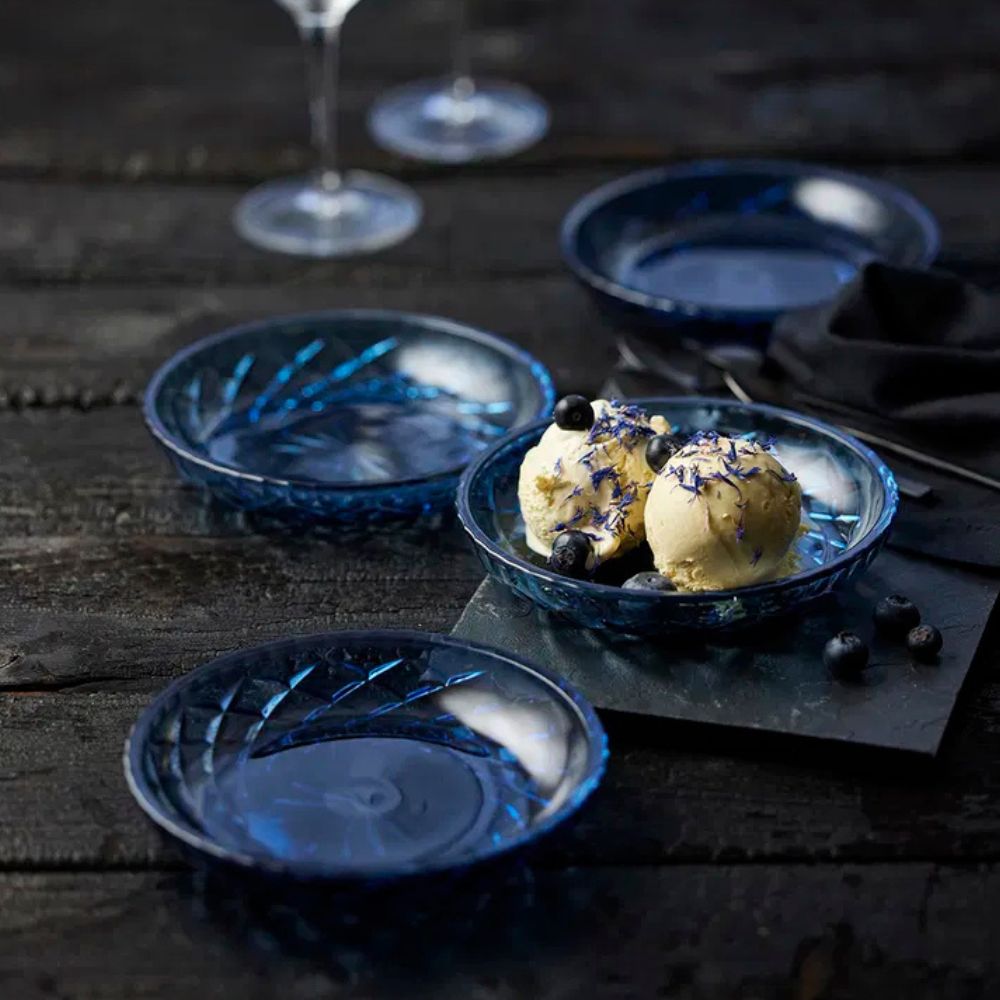 De eleganta Sorrento-tallrikarna från Lyngby Glas kombinerar klassisk estetik med modern porslin. Setet innehåller 4 tallrikar i massivt blått glas med en diameter på 16 cm - perfekta för lunch, tårta, dessert eller mindre portioner.