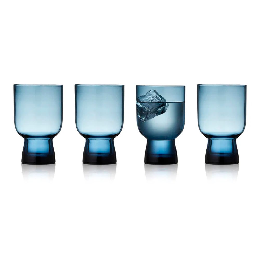 De vackra Sorrento-vattenglasen från Lyngby Glas kombinerar klassisk elegans med ett modernt uttryck. Setet innehåller 4 vattenglas i massivt blått glas med en kapacitet på 30 cl – perfekt för vatten, juice eller andra förfriskningar i vardagslivet och vid festliga tillfällen.