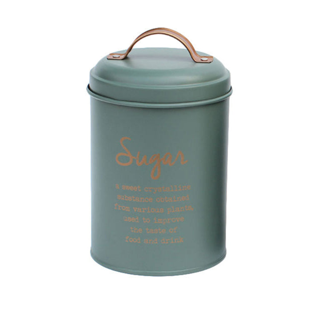 Denna förvaringsburk i metall i grönt med gulddetaljer mäter 11 x 15 cm och är perfekt för förvaring av socker eller andra torra ingredienser. Den snygga färgkombinationen gör den både praktisk och dekorativ på köksbänken, samtidigt som den håller innehållet fräscht.