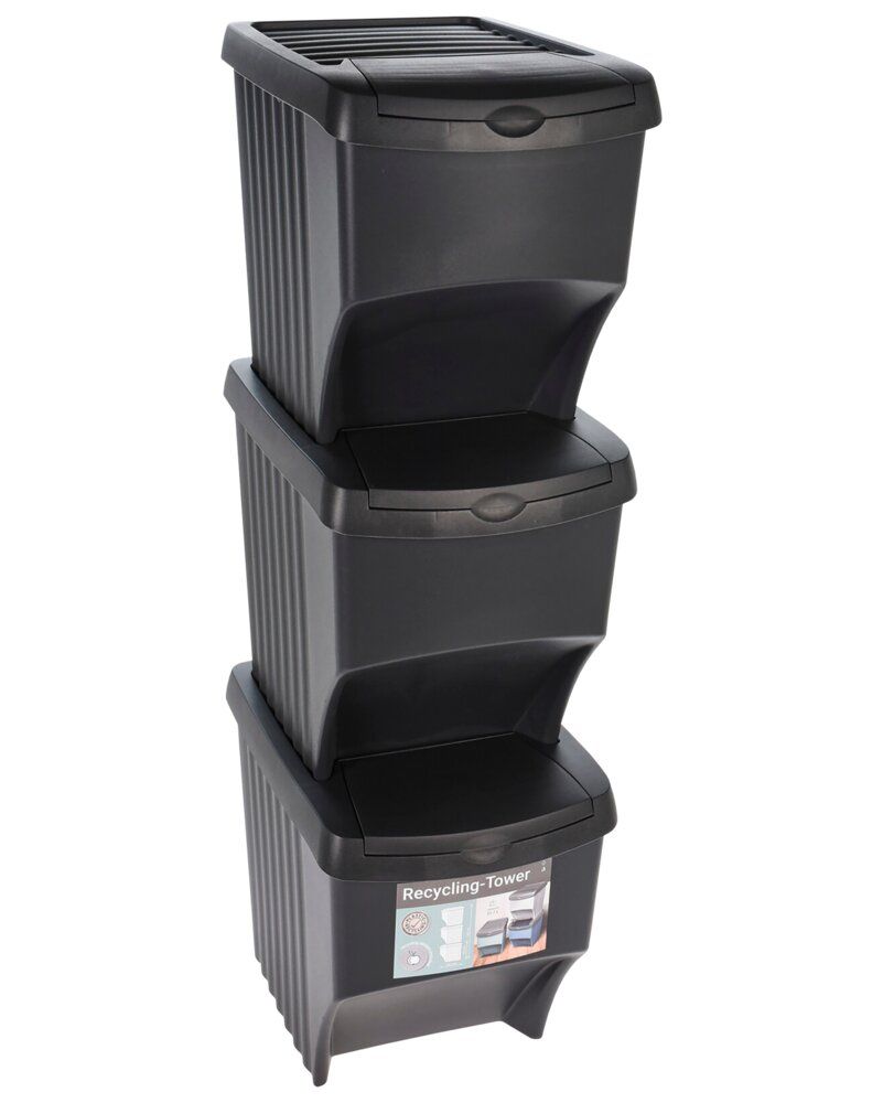 Denna uppsättning med tre soptunnor är det perfekta valet för alla som vill göra en insats för att sortera sitt avfall och bidra till miljövänliga metoder. Soptunnorna har en enkel men stilren design med en elegant svart färg.