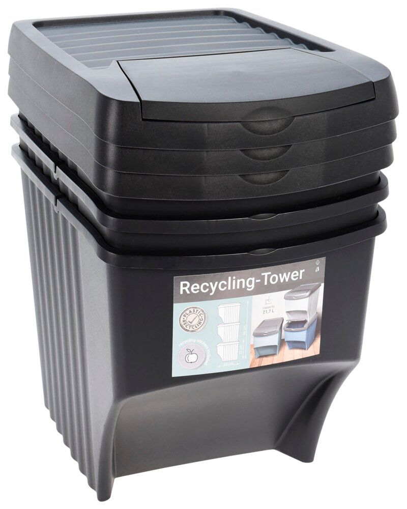 Setet innehåller tre soptunnor som gör det enkelt att sortera olika typer av avfall. Varje papperskorg har en kapacitet på 22 liter och är tillverkad av robust plast som är lätt att rengöra och hålla fri från lukt och bakterier.