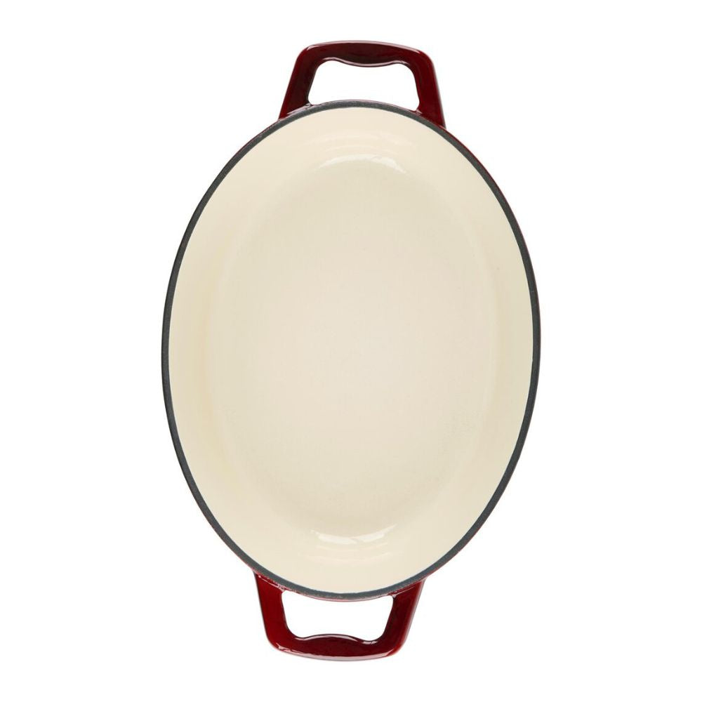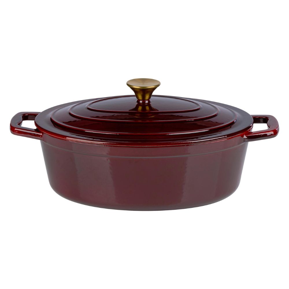 Denna eleganta Alpina-gryta i gjutjärn i en varm vinröd färg kombinerar klassisk design med utmärkt funktionalitet. Med sin ovala form och 5-literskapacitet är den idealisk för allt från långkokning och grytor till brödbakning.