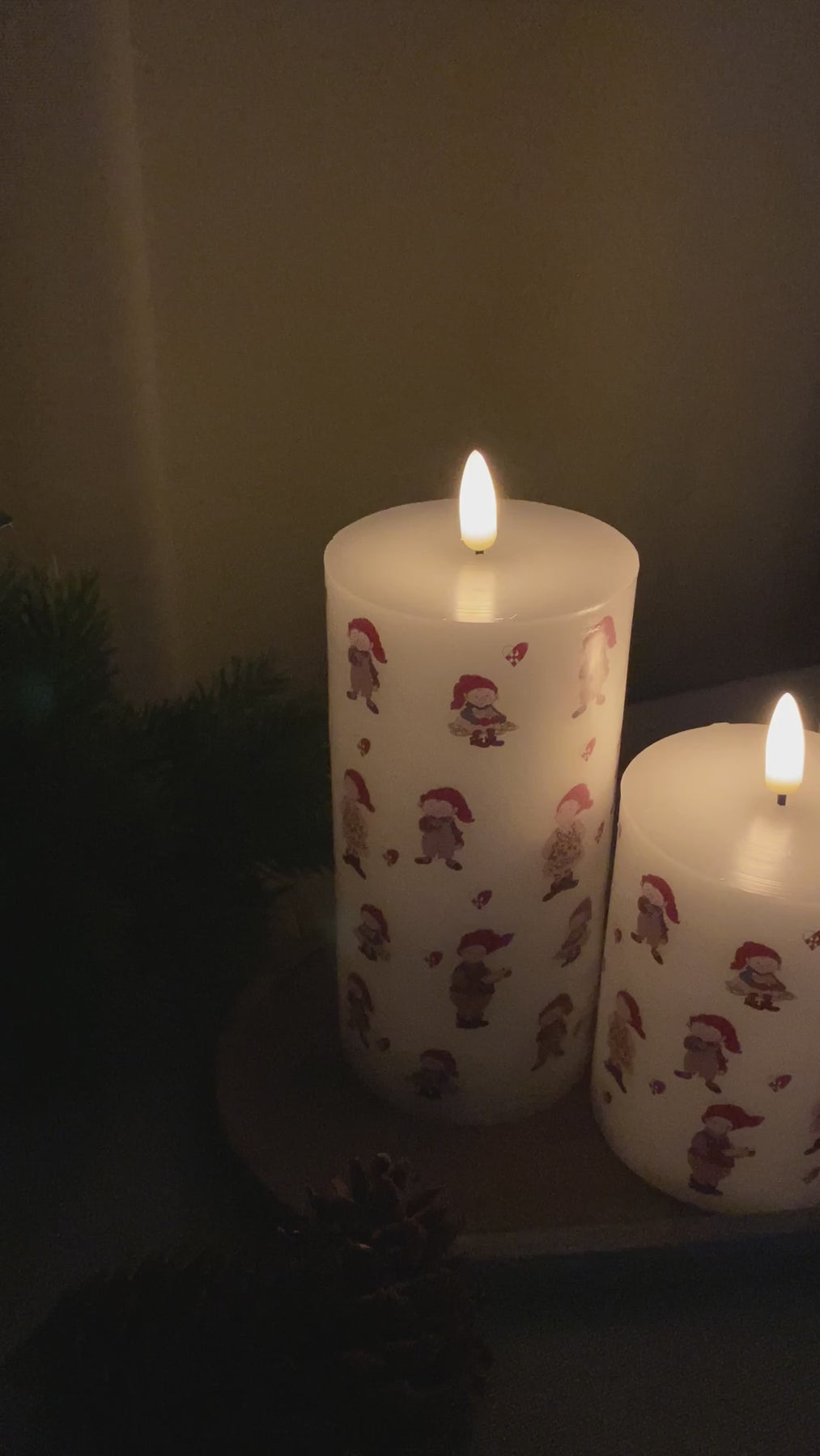 Dekorativa LED-vaxljus med realistiska 3D-lågor som skapar mysig belysning utan risk för öppen eld. Perfekt för att sprida julstämning i hemmet med motiv av små jultomtar. Ljusen styrs enkelt med den medföljande fjärrkontrollen, så att du kan tända, släcka eller justera ljusstyrkan utan att behöva resa dig upp. Lämpliga för bord, hyllor eller på fönsterbrädan som en trygg och stämningsfull dekoration i december.
