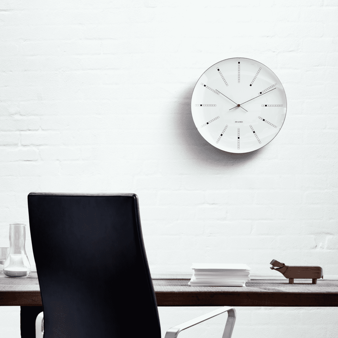 Arne Jacobsen Bankers väggklocka Ø21 cm är ett ikoniskt danskt designstycke, skapat speciellt för Nationalbanken. Klockan är ett exempel på Jacobsens helhetstänkande, där även de minsta detaljerna i en byggnad utformades med omsorg. Med sitt minimalistiska uttryck och den eleganta kombinationen av svart, vitt och en diskret röd detalj framstår klockan som både tidlös och modern. Tack vare samarbetet med Teit Weylandt är designen trogen originalritningarna. Ett självklart val för hemmet eller som en gåva som kan gå i arv i generationer.