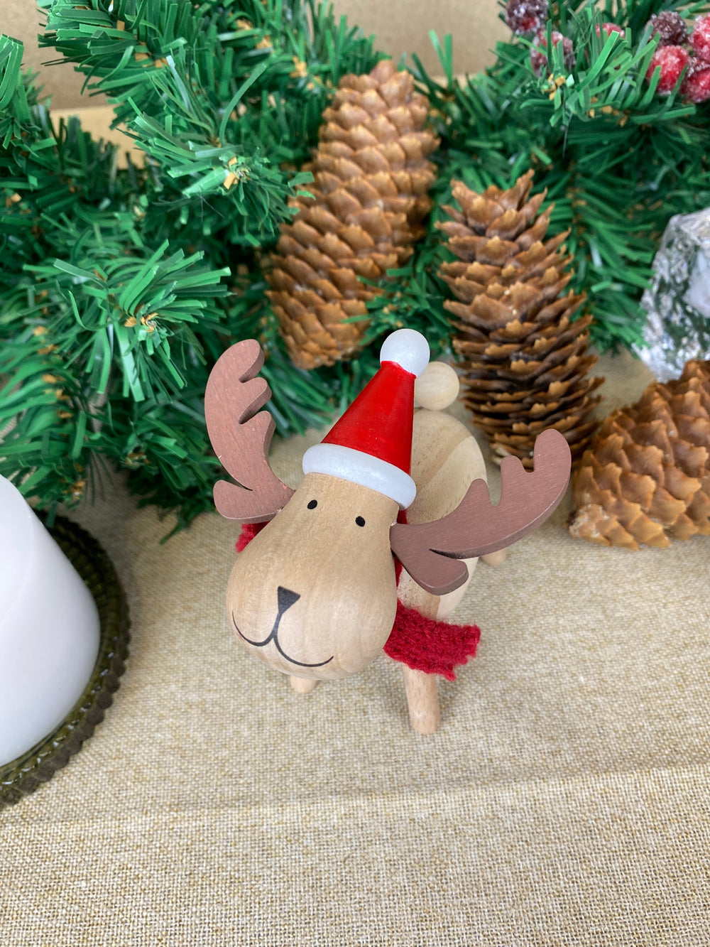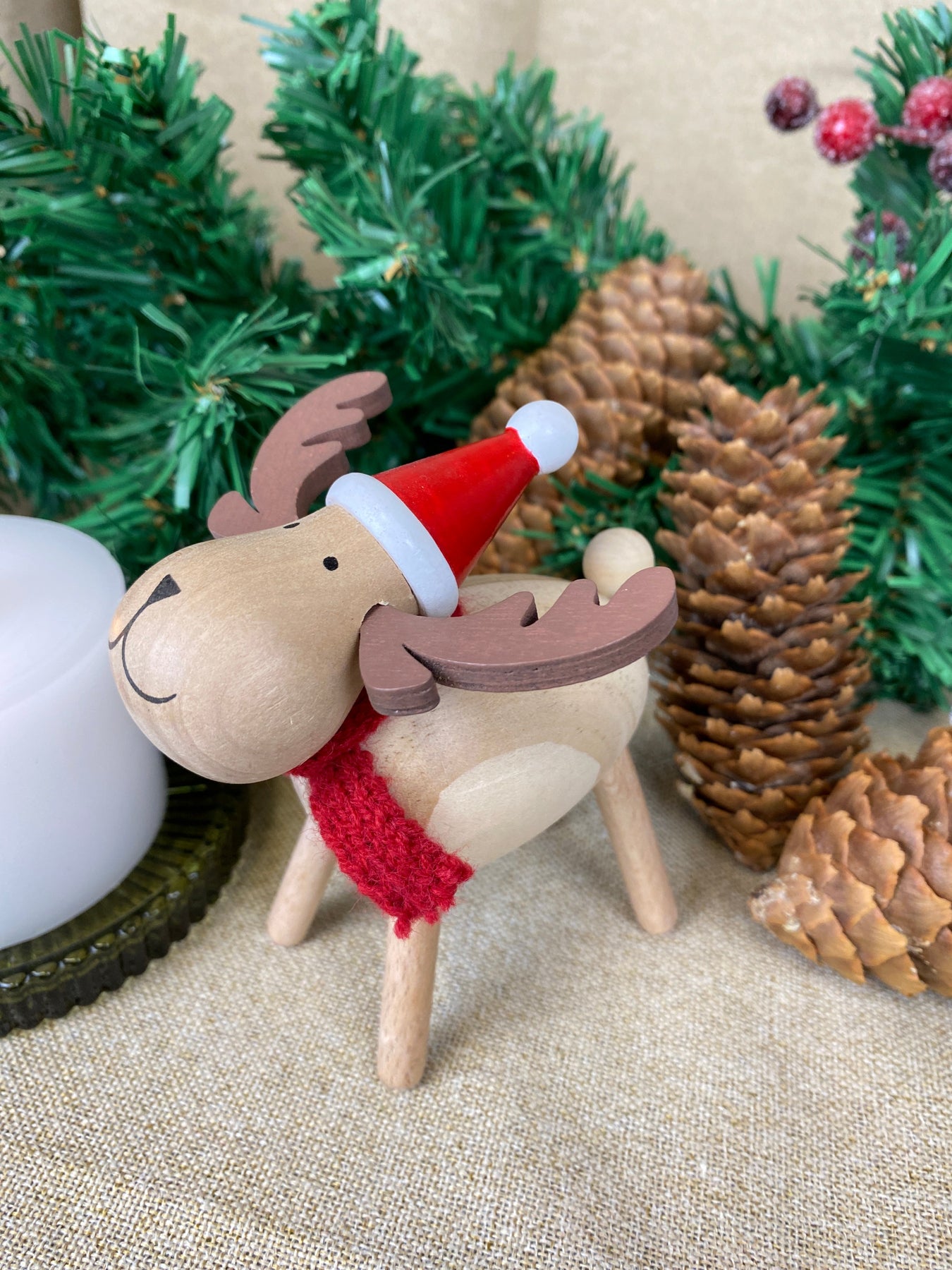 Dekorativ träfigur formad som en ren med tomteluva , tillverkad av naturfärgad furu. Figurinen har ett mysigt, handgjort utseende som passar perfekt till både moderna och klassiska juldekorationer.