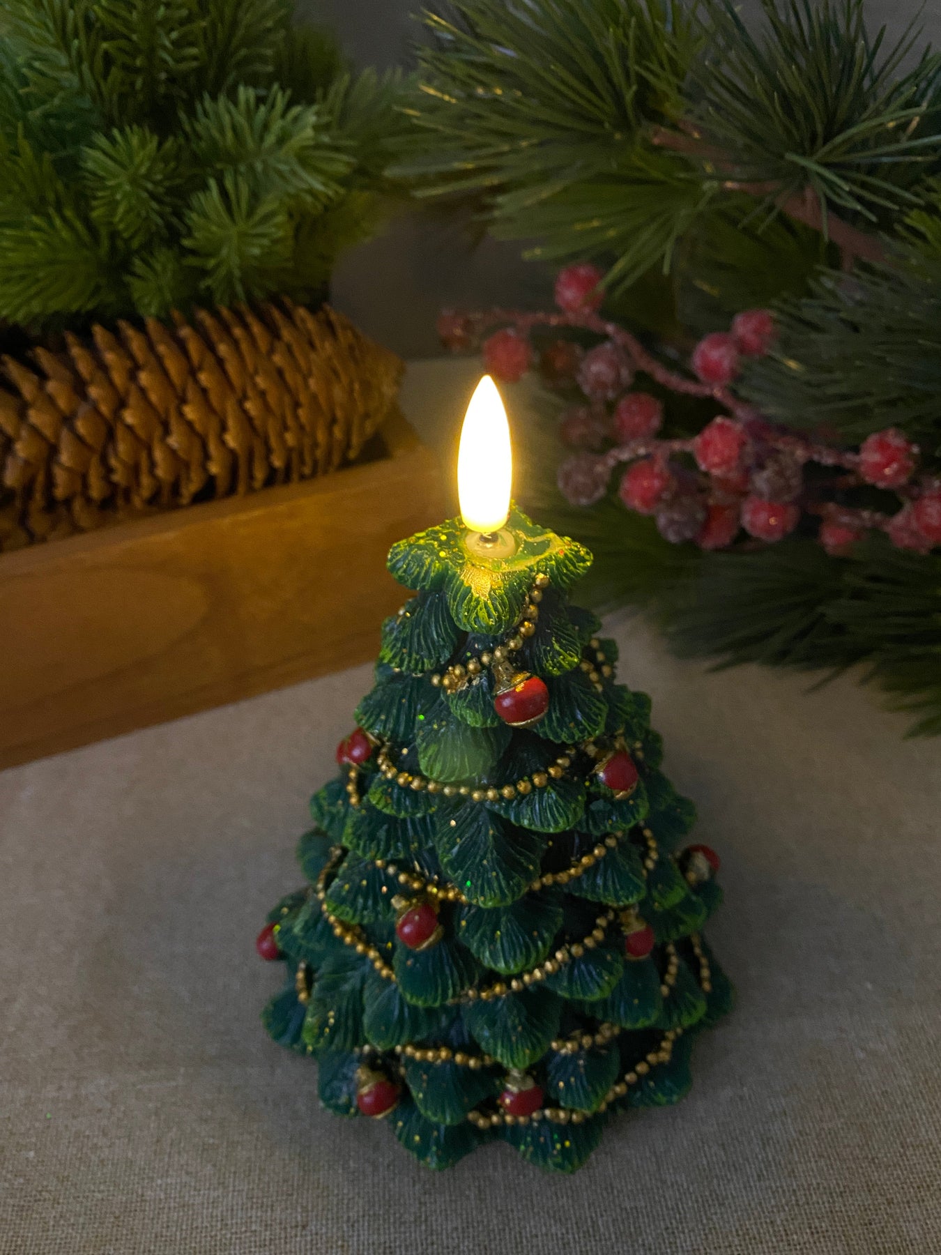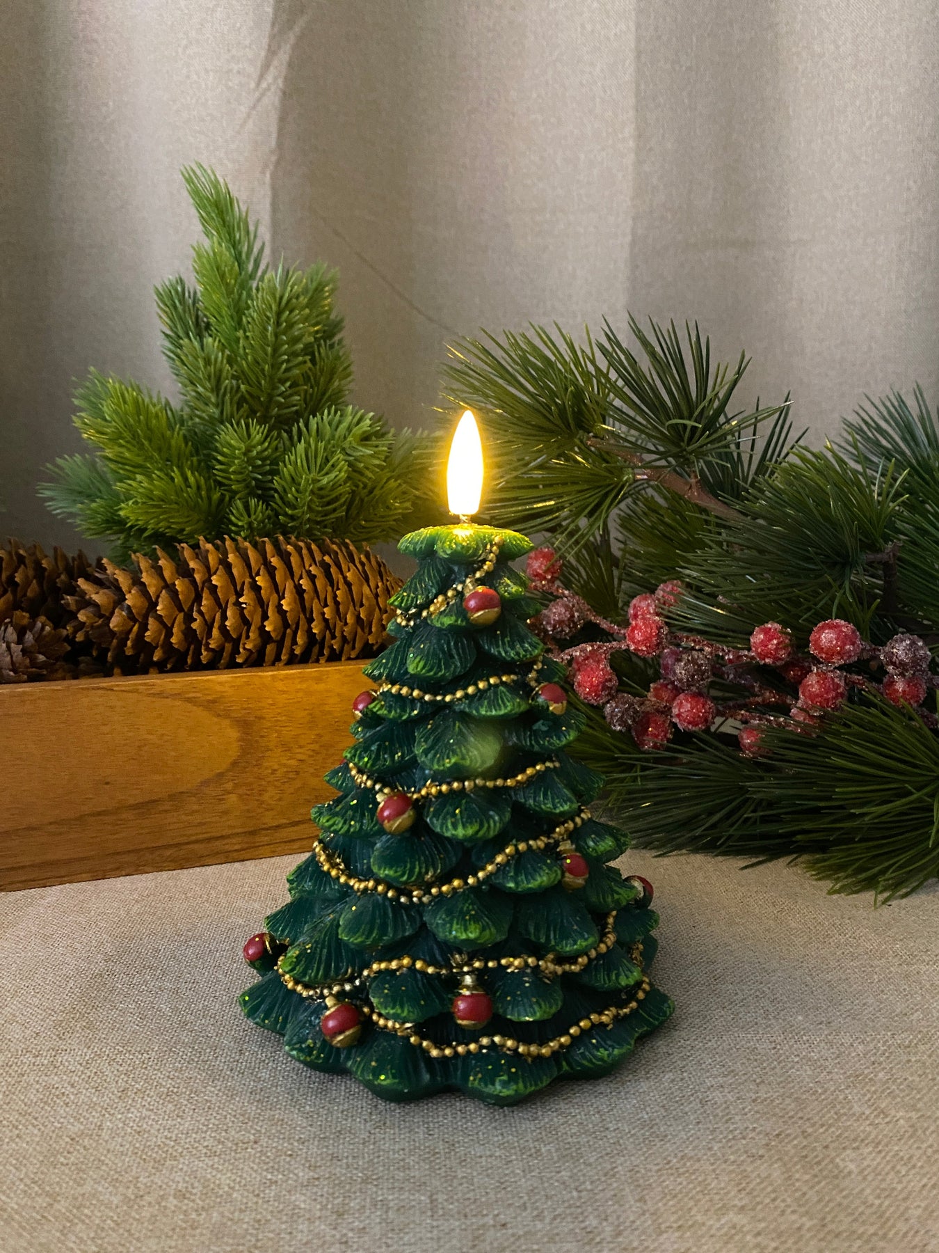 Skapa en mysig och stämningsfull jul med detta LED-vaxljus format som en julgran i en elegant grön färg. Ljuset är tillverkat av riktigt vax , vilket ger ett naturligt utseende och ett varmt, livfullt sken – helt utan brandrisk.