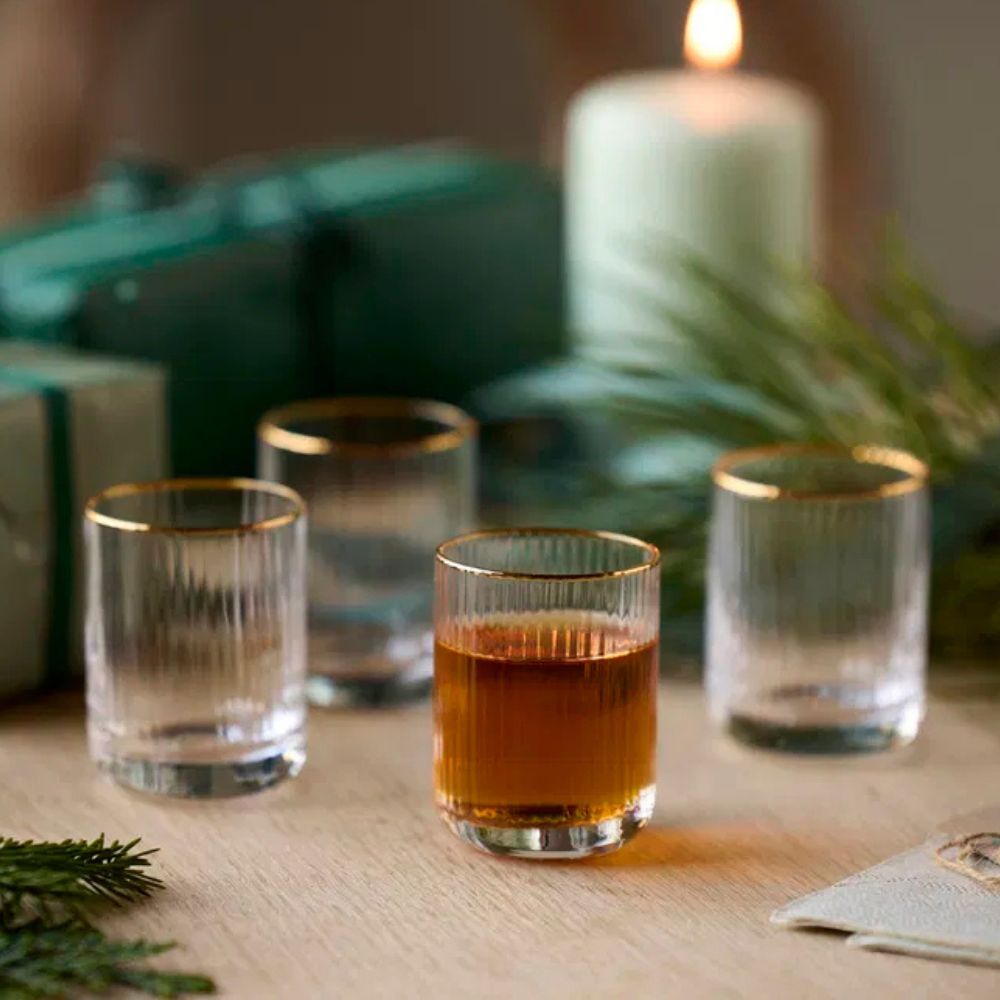 Lyngby Palermo shotglas i guld är perfekta för servering av små drycker som shots eller likörer. Med sin eleganta guldfärgade kant och munblåsta glas kombinerar de funktionalitet med ett exklusivt utseende som passar både festliga tillfällen och snygga dukningar.