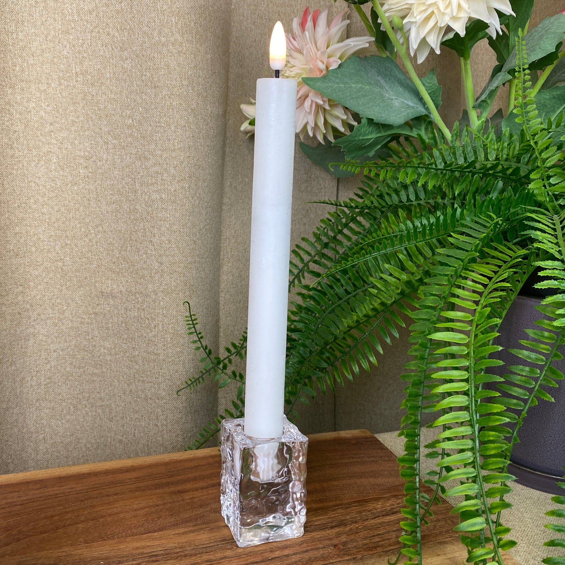 Kompakt ljusstake i glas , perfekt för ljus. Den enkla och klara glasdesignen gör den mångsidig för bordsdukning, fönsterbrädor eller små dekorativa arrangemang, där den skapar ett varmt och mysigt ljus.