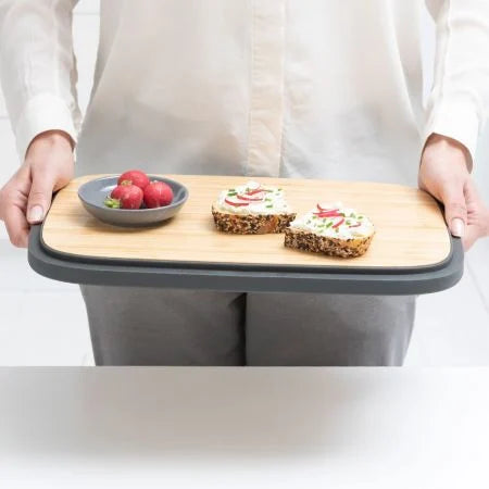 Brabantia Nic brödkorg förvandlar dukningen till en picknick tack vare de lätta handtagen. Den har ett vackert lock i bambu och ett praktiskt bärhandtag som gör den enkel att ta med från köksbänken till matbordet. Den här vackra brödlådan har plats för två limpor och den räfflade botten underlättar ventilationen undertill. Lätt i köket, bra på bordet!