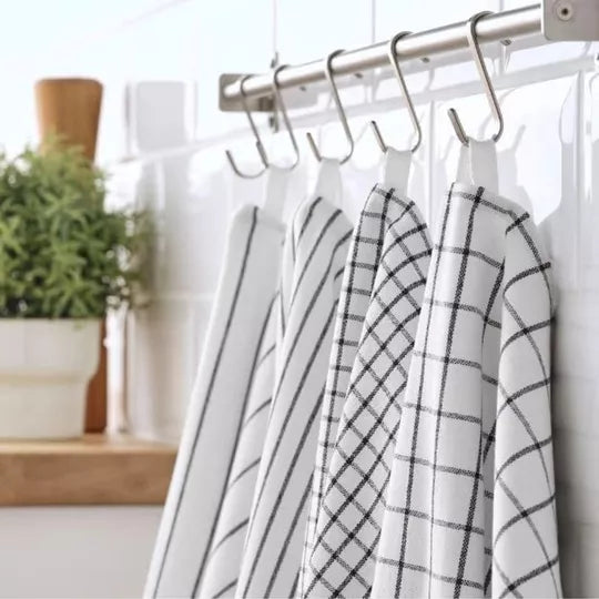 Detta eleganta kökshandduksset består av fyra delar, var och en på 45 x 60 cm, som är perfekta för dagligt bruk i köket. Kökshanddukarna är gjorda av 90% bomull och 10% viskos och Lyocell, vilket ger dem en mjuk men hållbar kvalitet. Setet kommer i en klassisk vit och mörkgrå färg som matchar alla köksinredningar. Varje kökshandduk har ett unikt tryck som ger variation och en dekorativ touch till ditt kök.