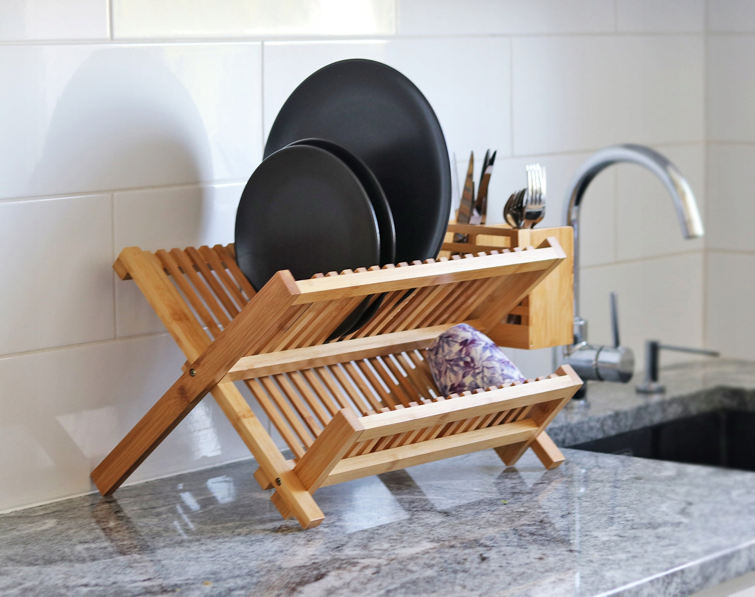Diskstället har en stor yta för tallrikar och skålar, samt en bestickhållare och en hylla för glas. Den är lätt att montera och rengöra, och den fälls ihop för enkel förvaring när den inte används. Med Excellent Housewares diskställ i bambu blir dina diskar alltid organiserade och torra på nolltid.
