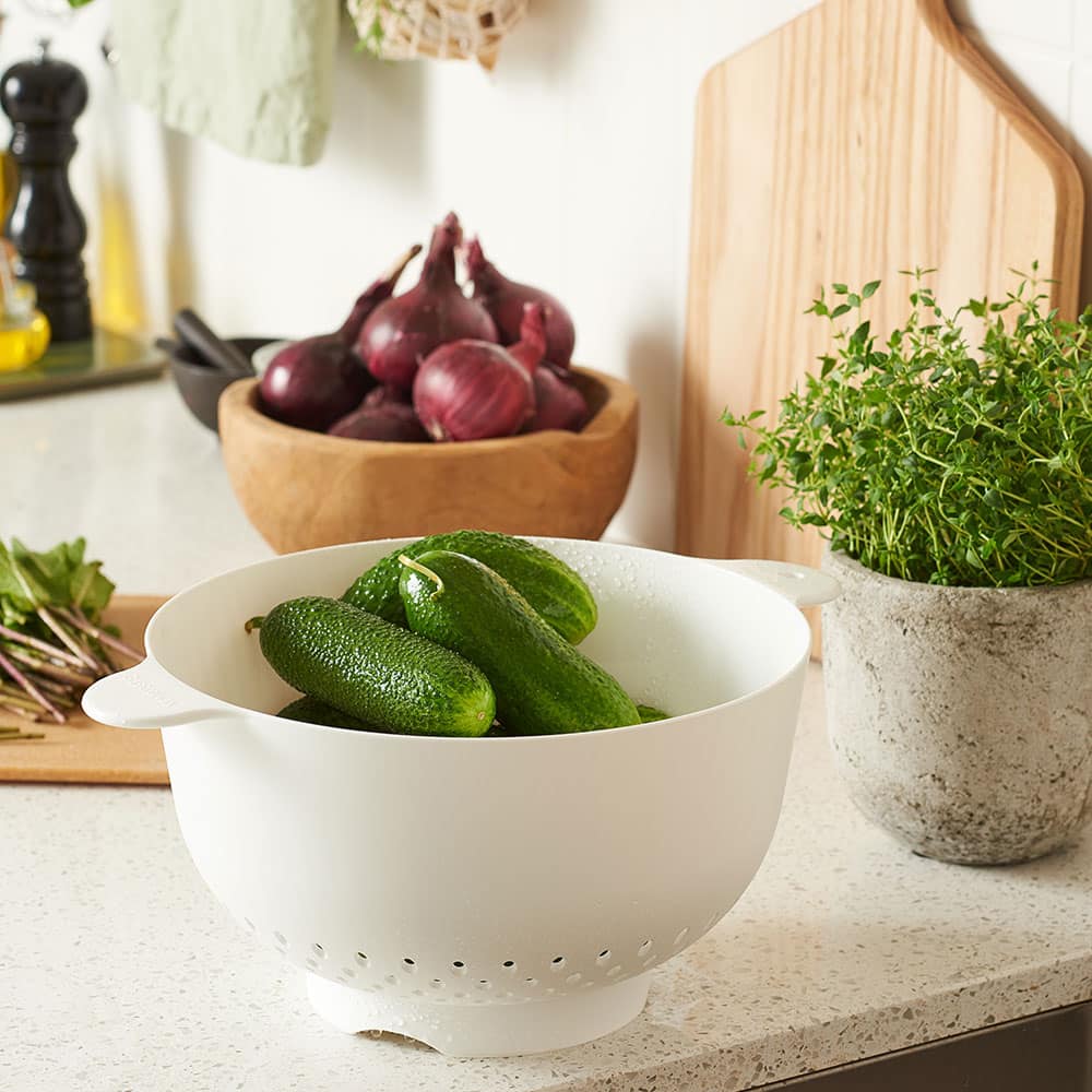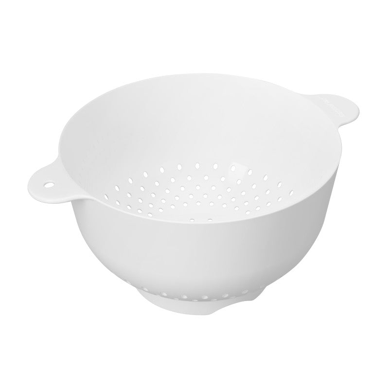 Durkslaget har en generös storlek som gör det enkelt att hantera större mängder ingredienser. Det är utrustat med små hål som gör att överflödig vätska kan rinna av effektivt samtidigt som maten hålls kvar i durkslaget.