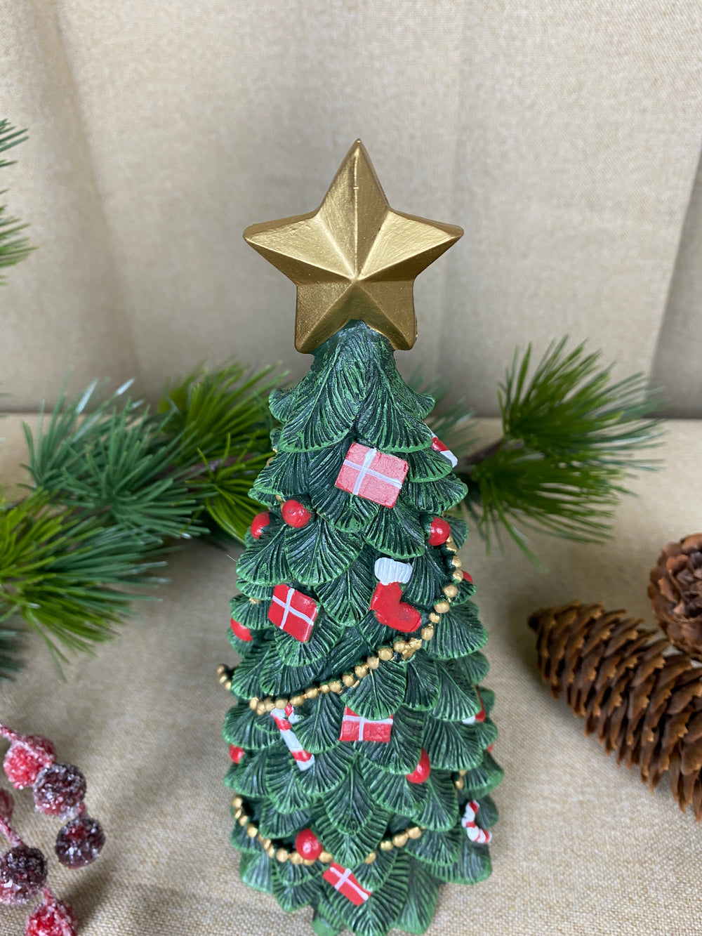 Denna vackra julgransfigur i mörkgrön polyresin är dekorerad och redo att sprida julstämning i ditt hem. Med sin kompakta höjd på 23,5 cm passar den perfekt på bordet, i fönsterbrädan eller på hyllan och kan kombineras med andra juldekorationer för en mysig och festlig look. Robust material säkerställer att figurinen kan användas år efter år som en klassisk del av din juldekoration.