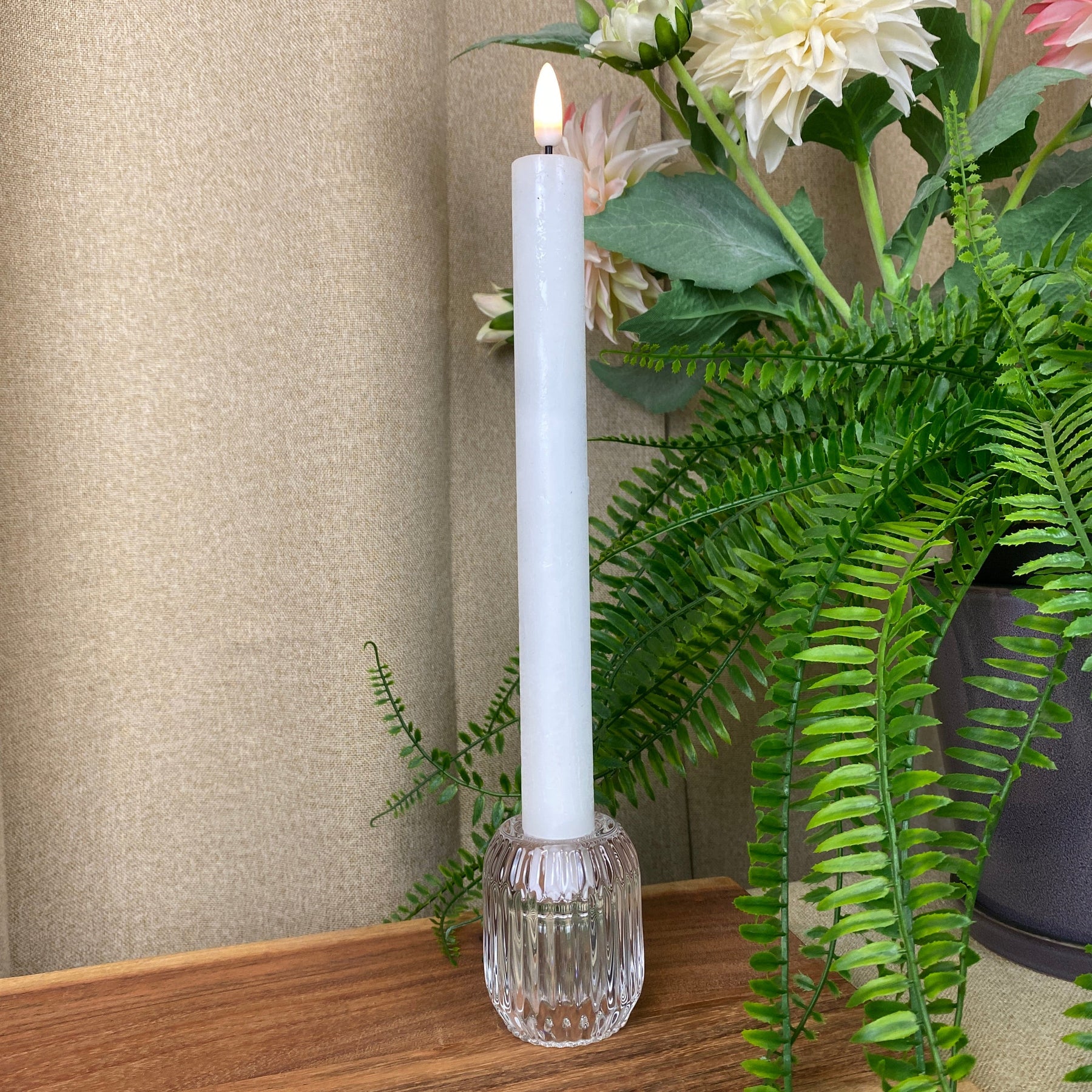 Kompakt ljusstake i glas , perfekt för ljus. Den enkla och klara glasdesignen gör den mångsidig för bordsdukning, fönsterbrädor eller små dekorativa arrangemang, där den skapar ett varmt och mysigt ljus.