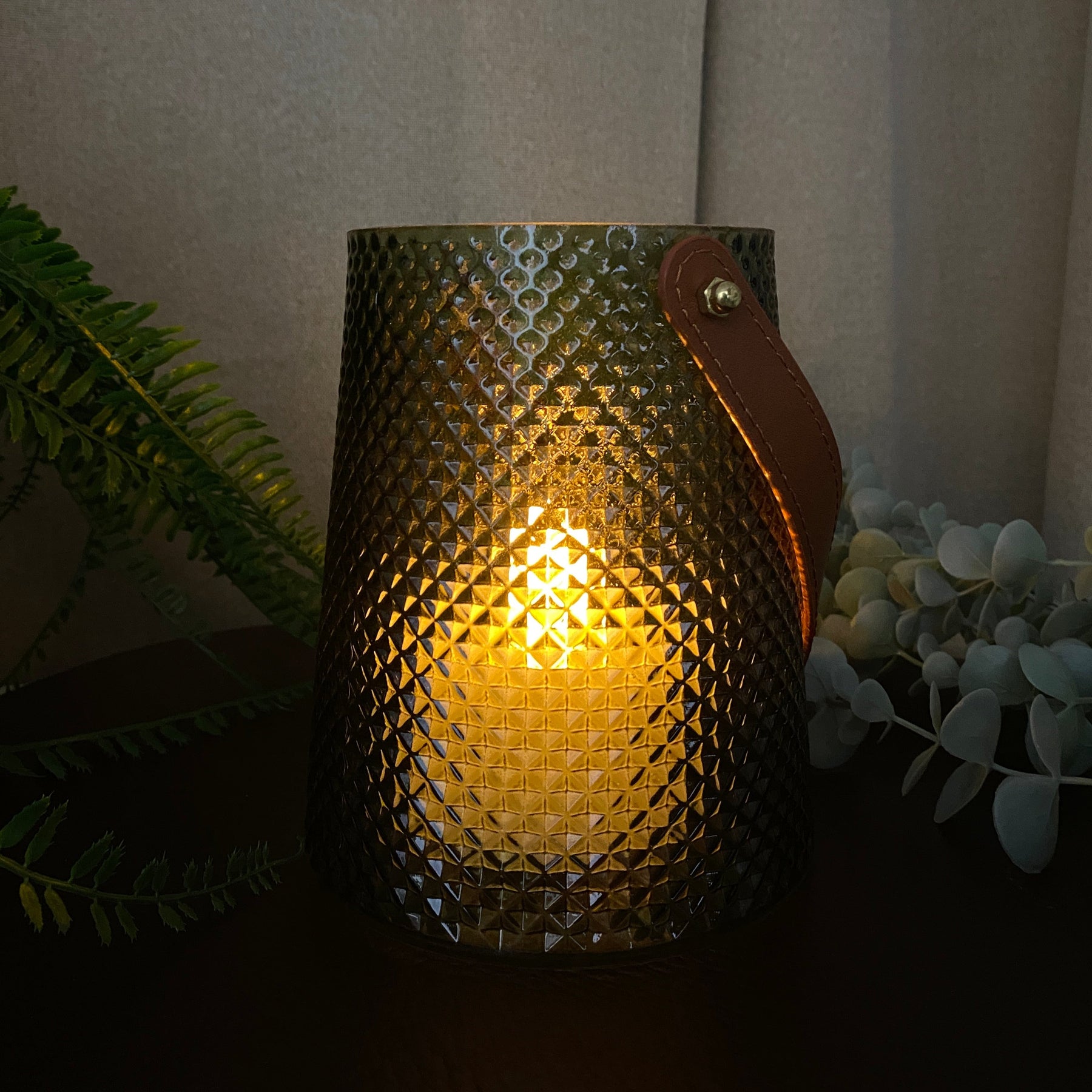 Dekorativ ljusstake i grönt glas med ett praktiskt handtag som gör den enkel att flytta runt. Ljusstaken skapar en mysig och varm atmosfär i hemmet, perfekt för levande ljus på bordet, i fönsterbrädan eller som en del av ett snyggt dekorationsarrangemang. Den enkla men eleganta formen passar in i både moderna och klassiska inredningar.