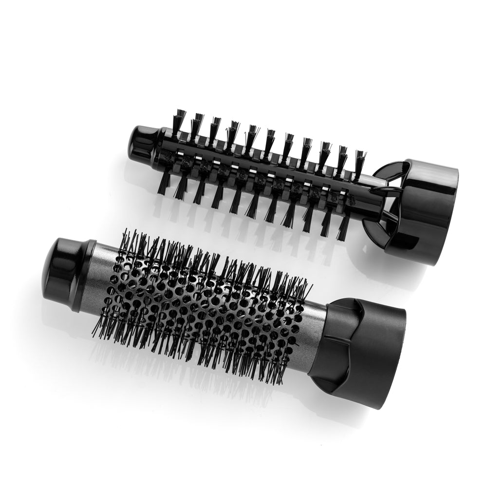 Det store børstehoved (32 mm) har en keramisk belægning og ionisk teknologi, der beskytter håret, modvirker statisk elektricitet og giver en smuk, glansfuld finish. Det mindre børstehoved (21 mm) er perfekt til at skabe løft og volumen ved hårrødderne.