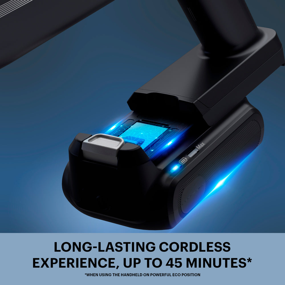 • Batteritid: Upp till 45 minuter i ECO-läge, så att du kan städa flera rum på en enda laddning.