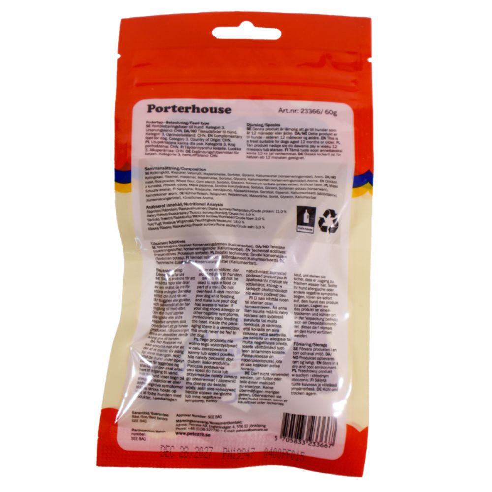 Småland Porterhouse är mjuka, saftiga hundgodis gjorda av kycklingkött och formade för att likna små porterhousebitar – fullpackade med massor av smak som hundar älskar. Den perfekta lilla belöningen som får vilken hund som helst att vifta på svansen, utan att kosta en förmögenhet.